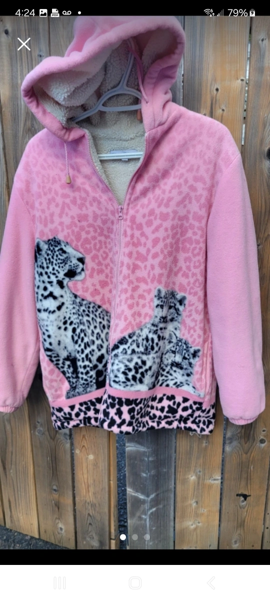 Here's a cozy pink jacket with a fun leopard print! It's perfect for staying warm and stylish. The hoodie features a soft, sherpa-lined interior and a full zip closure. The unique leopard design adds a touch of flair. It's in great condition and ready for a new home!