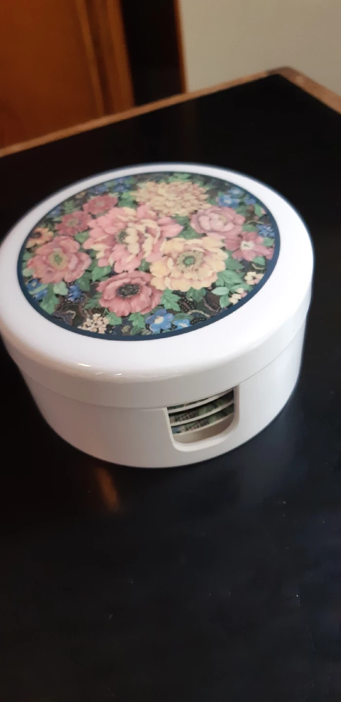 826A set of 6 Cloverleaf coasters with a lovely floral pattern! They're made in England and come with a handy holder to keep them organized. These coasters are heat and stain resistant, and are totally dishwasher safe. Perfect for adding a touch of charm to your living space!
