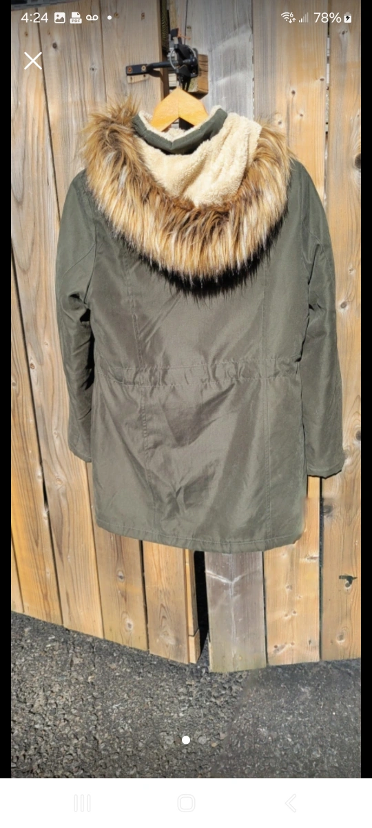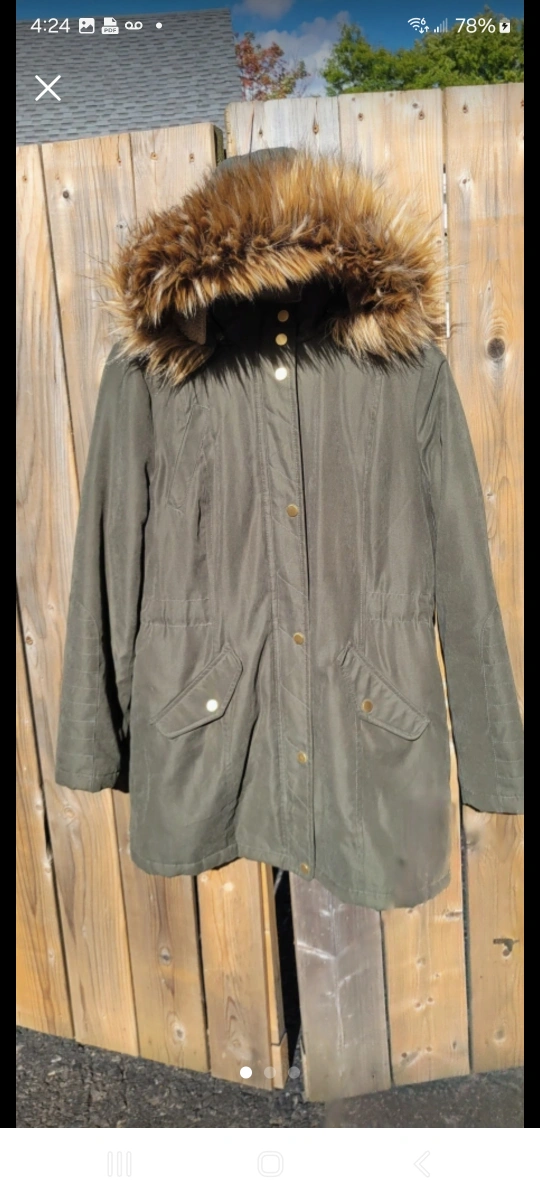 Cozy olive green winter parka, perfect for staying warm during those chilly Canadian months! It features a stylish faux fur hood and handy pockets. A great addition to your winter wardrobe!
