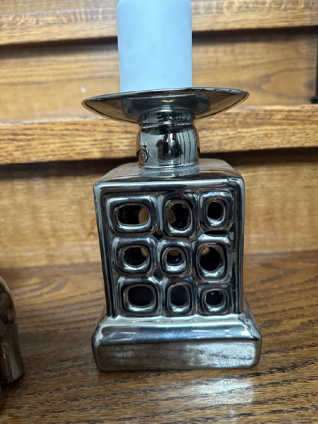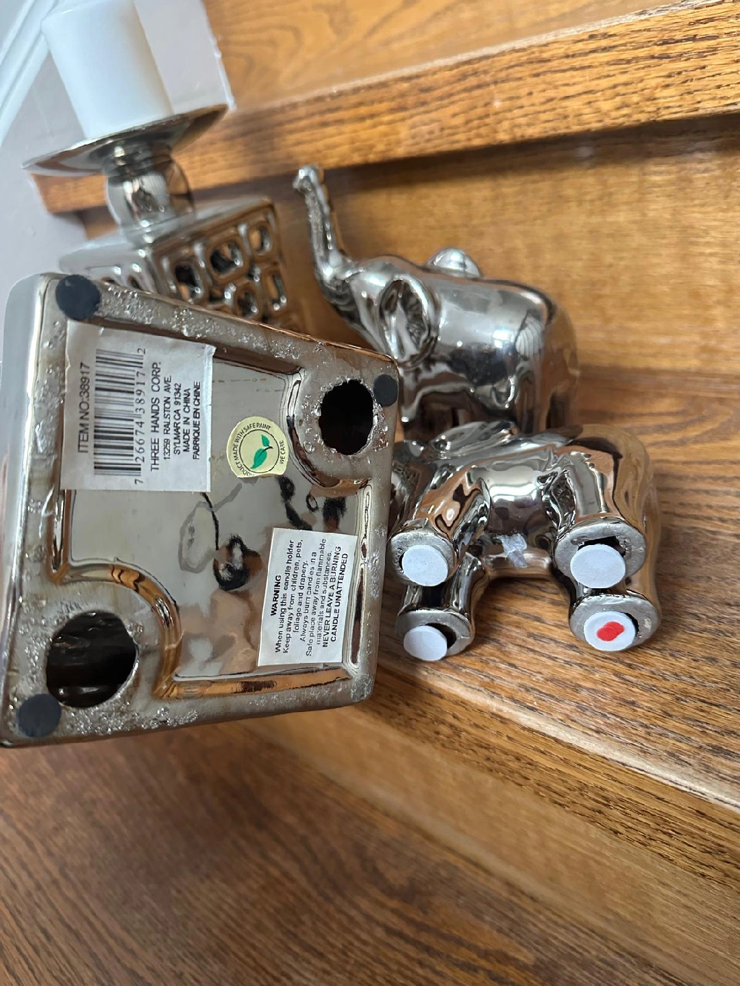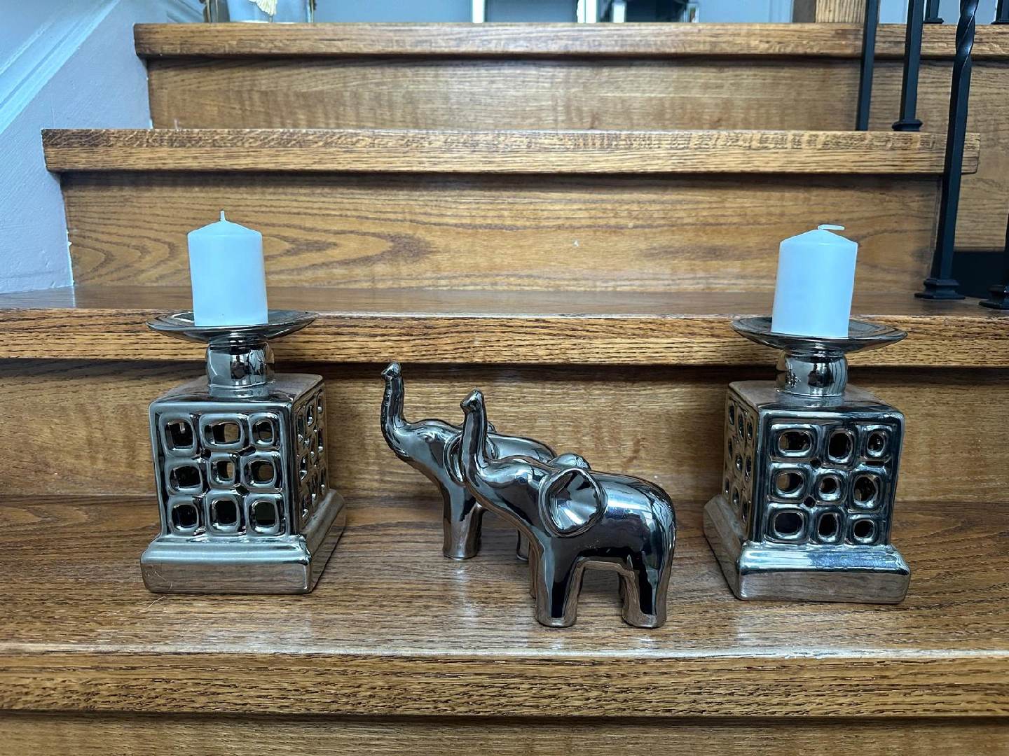 Selling a set of silver elephant figurines and candle holders. They're in great condition and would look lovely in any home! The candle holders have a unique square design with circular cutouts, adding a touch of modern elegance to your decor