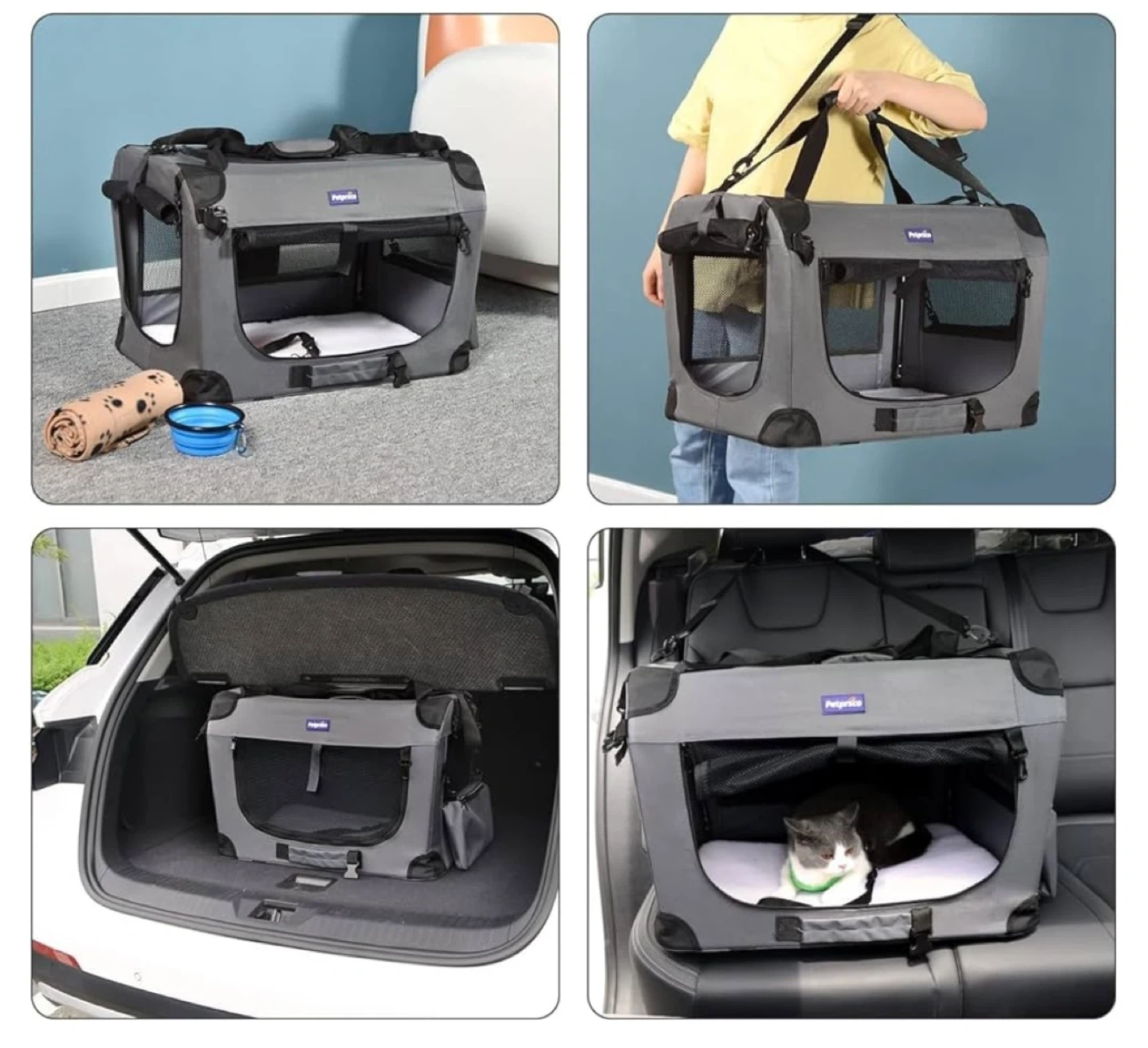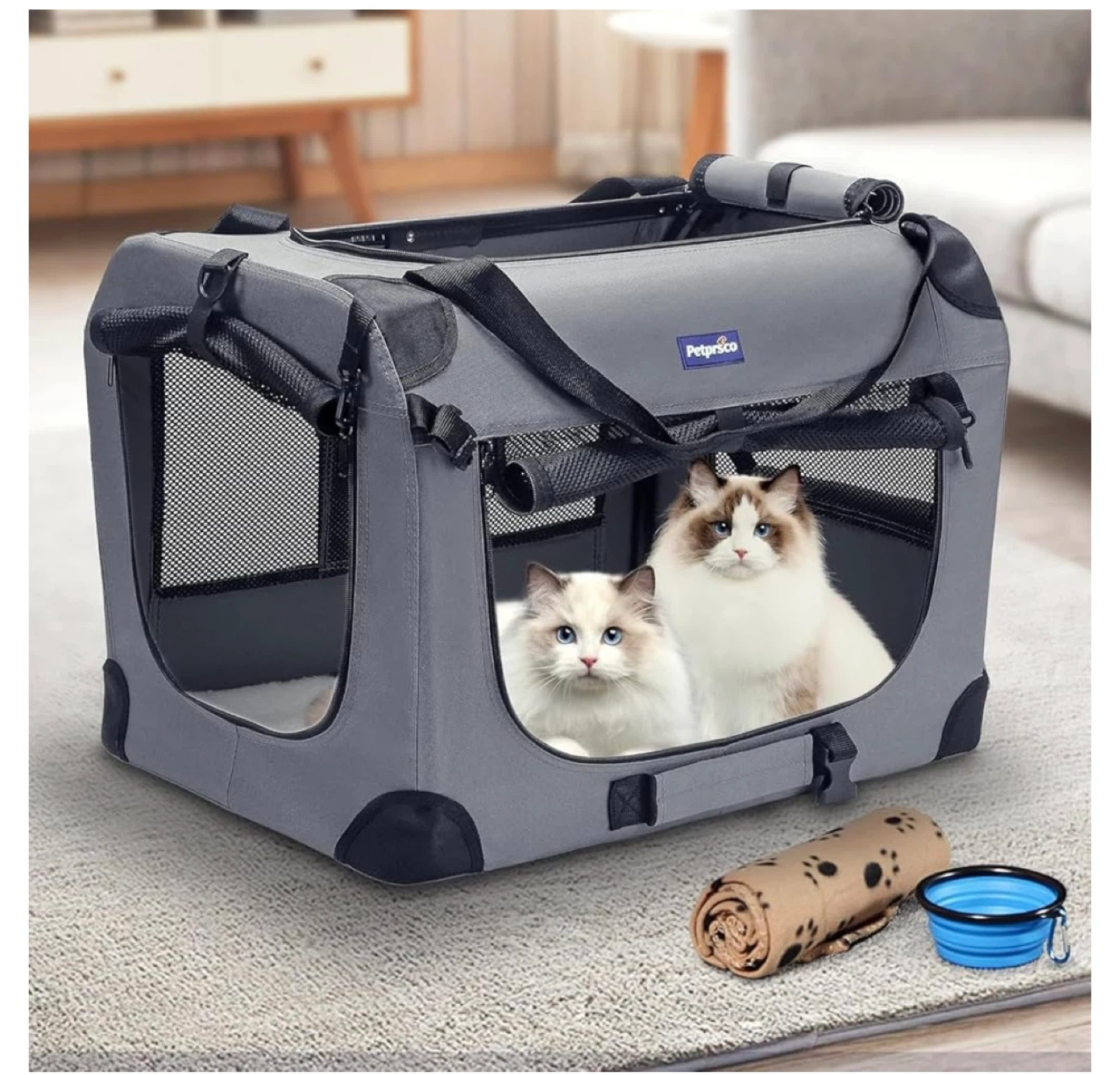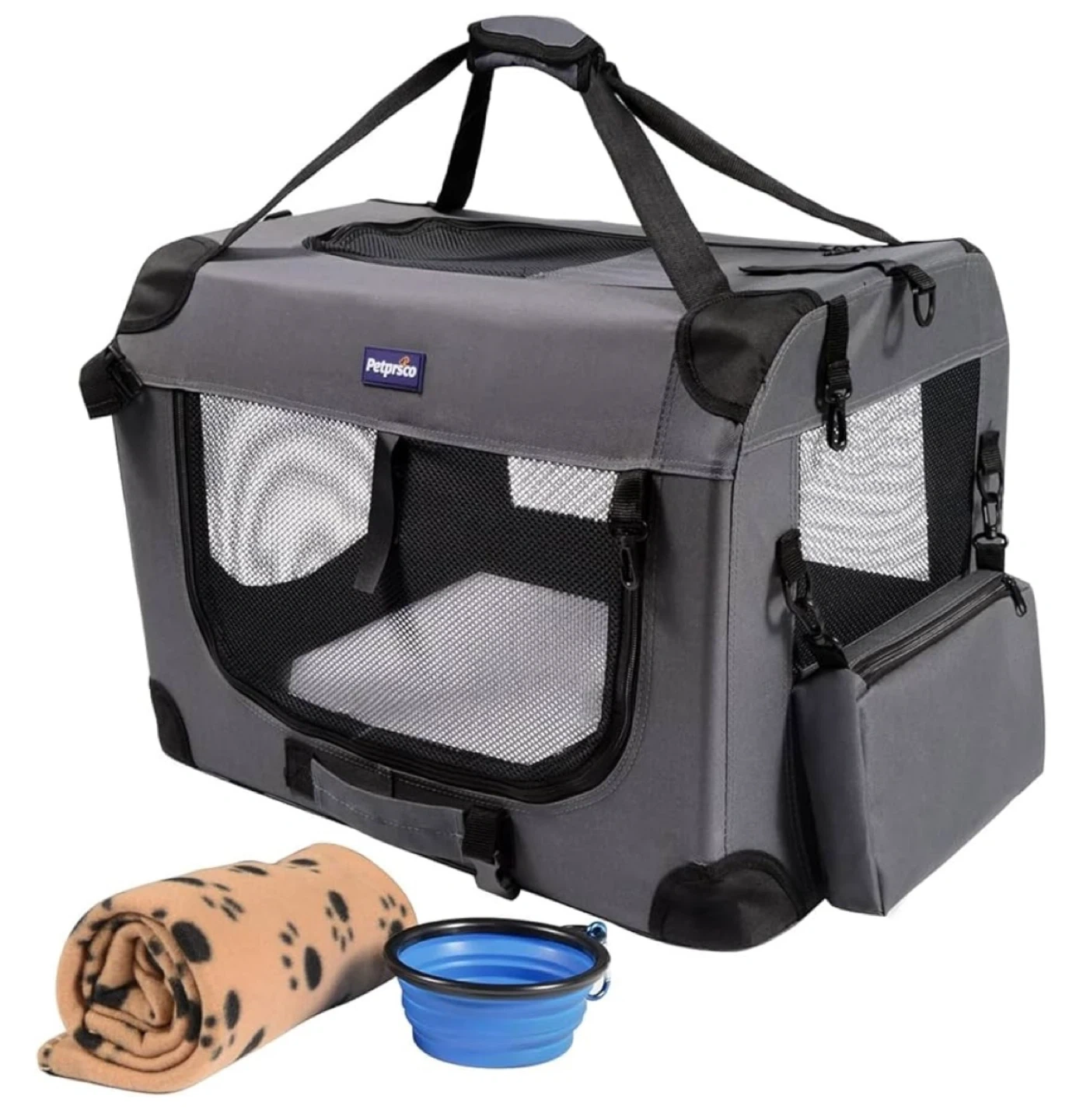 Looking to sell a Petsprico soft-sided pet carrier! It's in great shape and perfect for taking your furry friend on the go. The carrier features mesh windows for ventilation, a comfortable plush mat, and a convenient side pocket. It also has a single shoulder strap and an adjustable leash for added convenience