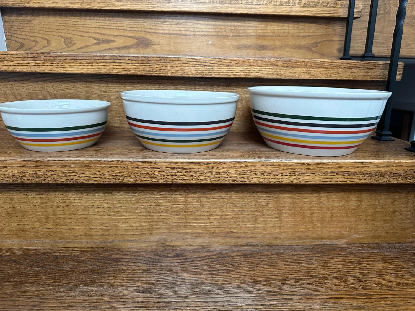 Selling a set of three ceramic mixing bowls! They feature a colourful striped design around the outside. They're in great shape and ready for a new home. Perfect for baking or serving