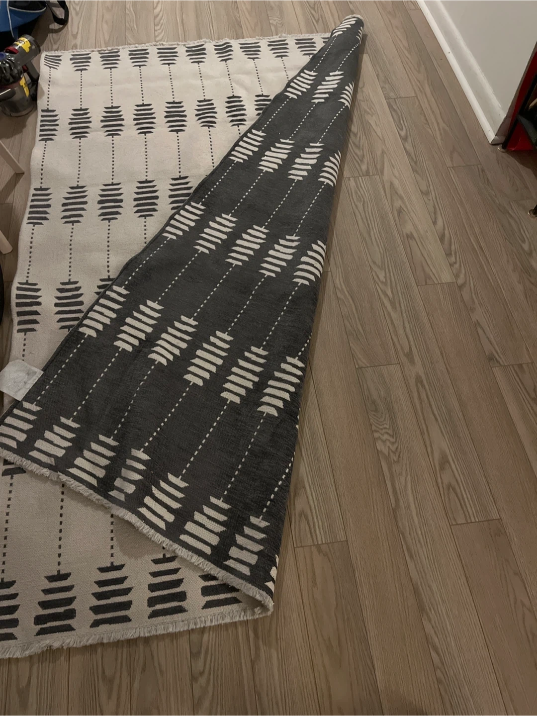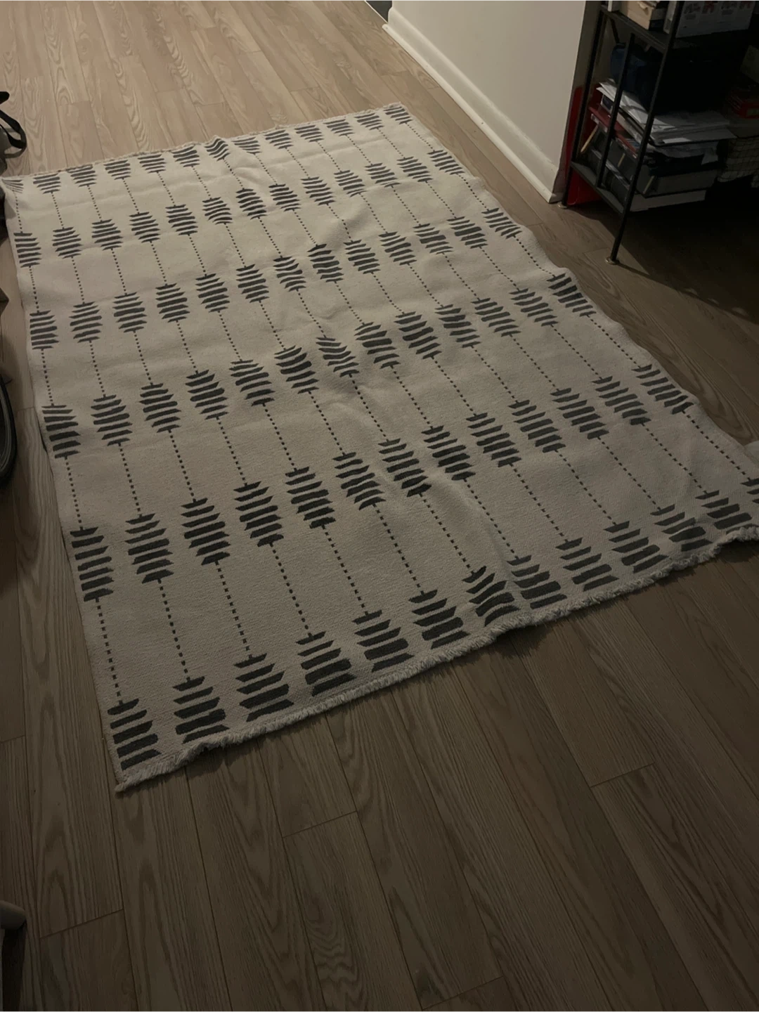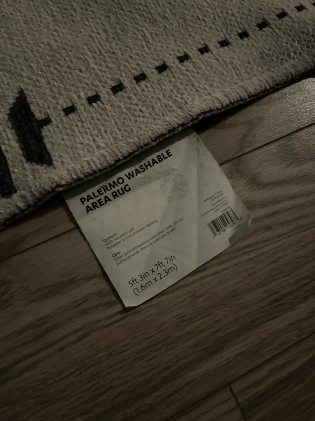 This is a Palermo washable area rug. It measures 5ft x 7ft (1.6m x 2.3m). The content is 100% polyester pile and polyester & cotton woven backing. It is in good condition and ready for a new home!