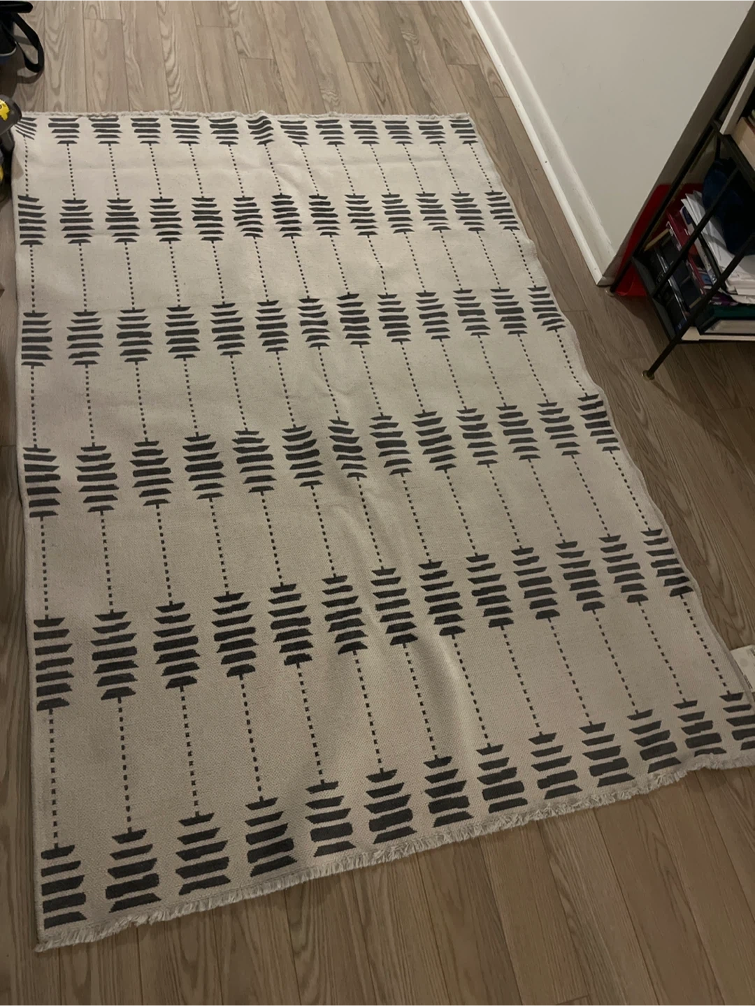 This is a Palermo washable area rug. It measures 5ft x 7ft (1.6m x 2.3m). The content is 100% polyester pile and polyester & cotton woven backing. It is in good condition and ready for a new home!
