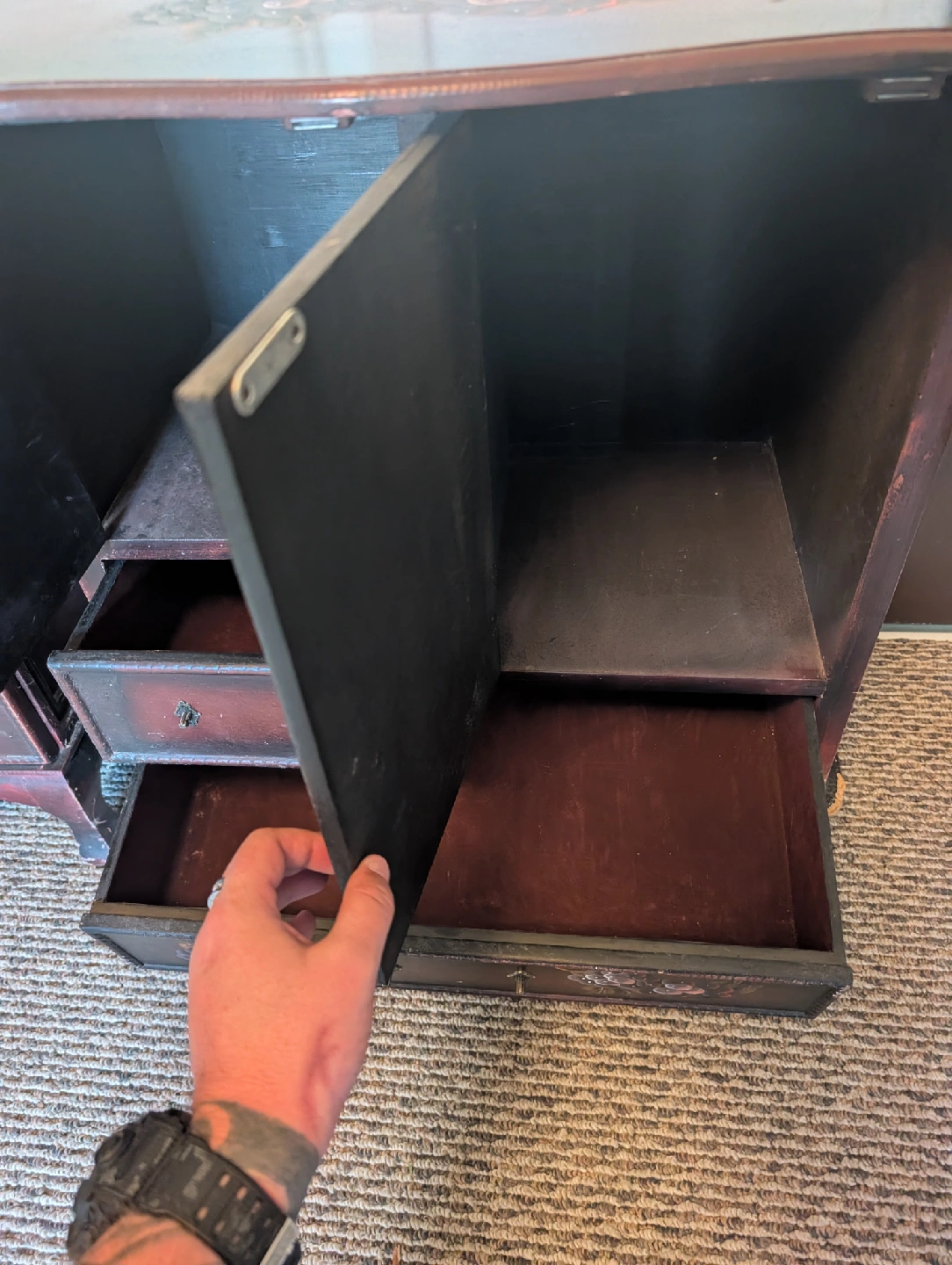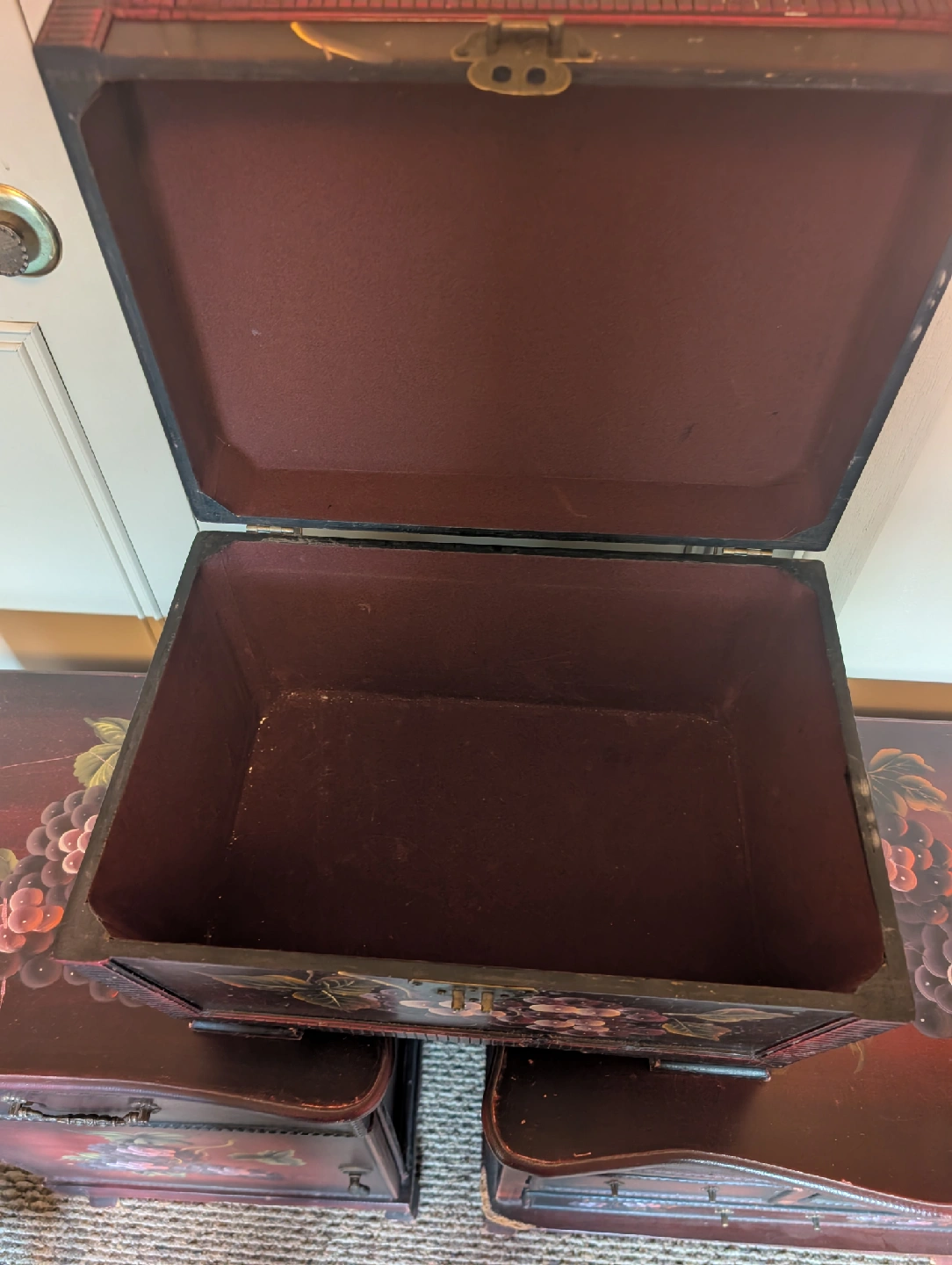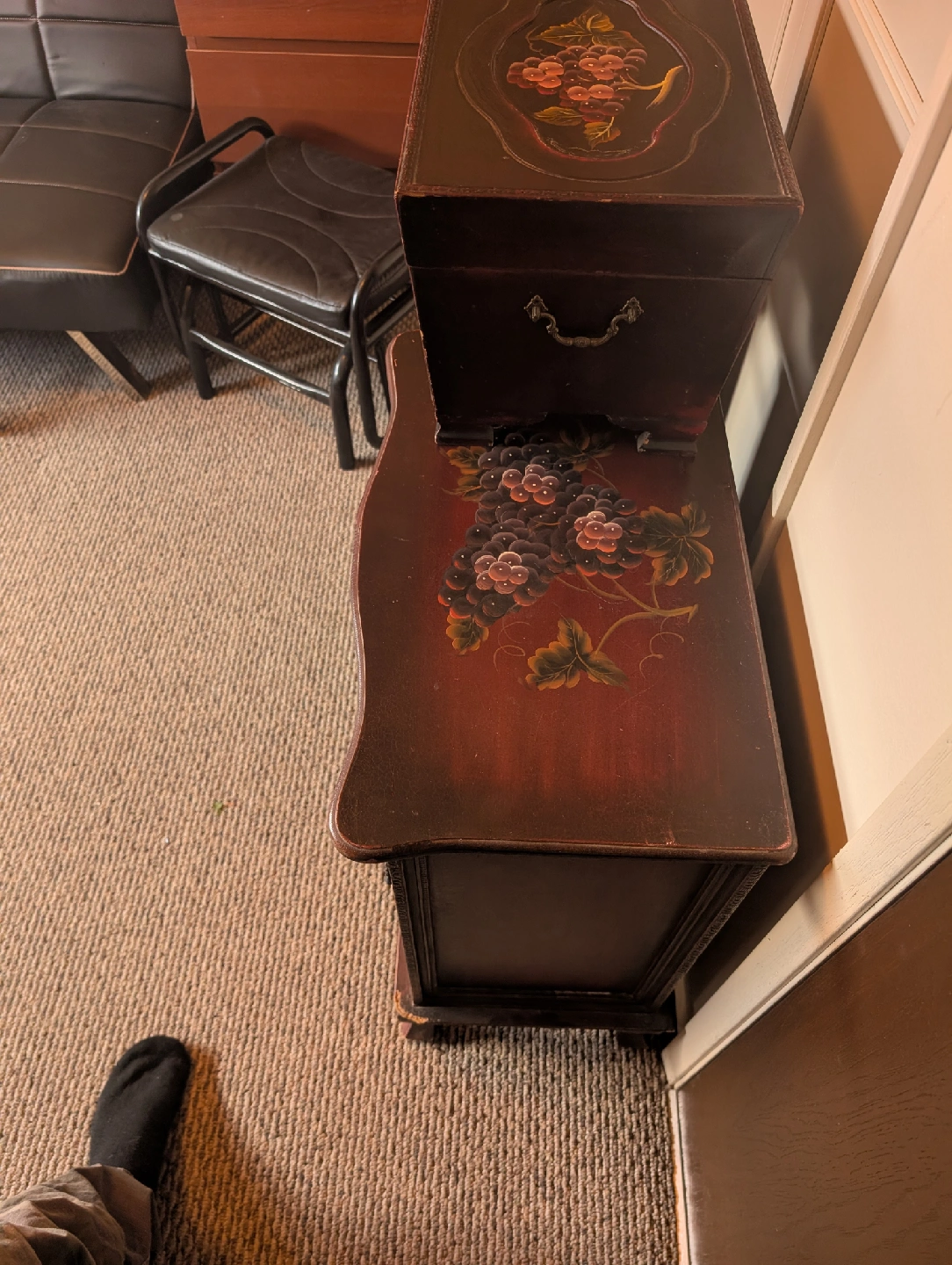 This is a verry unique beautiful antique hand crafted and hand painted carved with floral designes set of wardrobe furniture adding a good vintage and stylish look to any room and for storage or place great conversation piece and needs a new home verry well made has some ware due to its verry age but works fine still looks good hard to find things made like this anymore asking 410$ or best offer open make offers !!!
