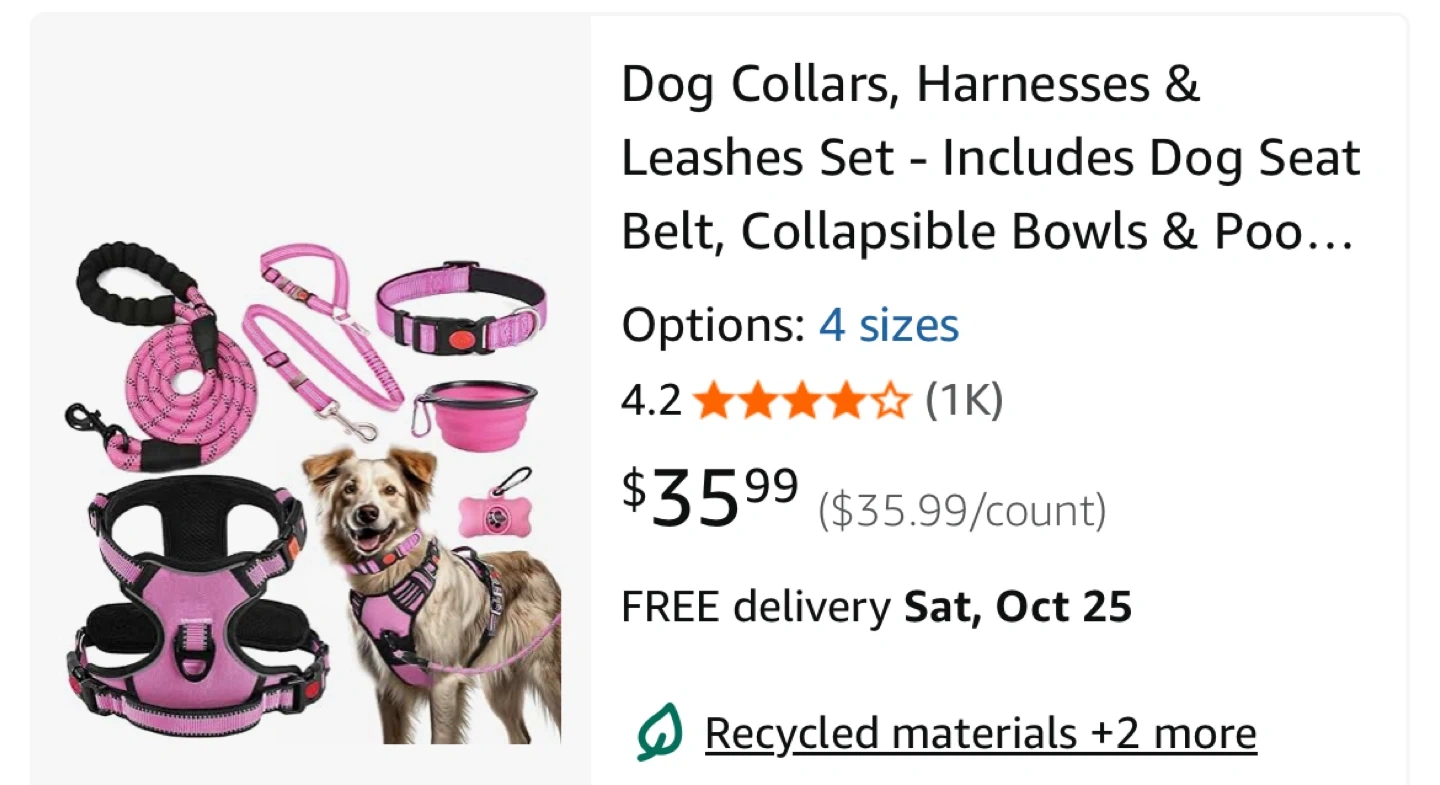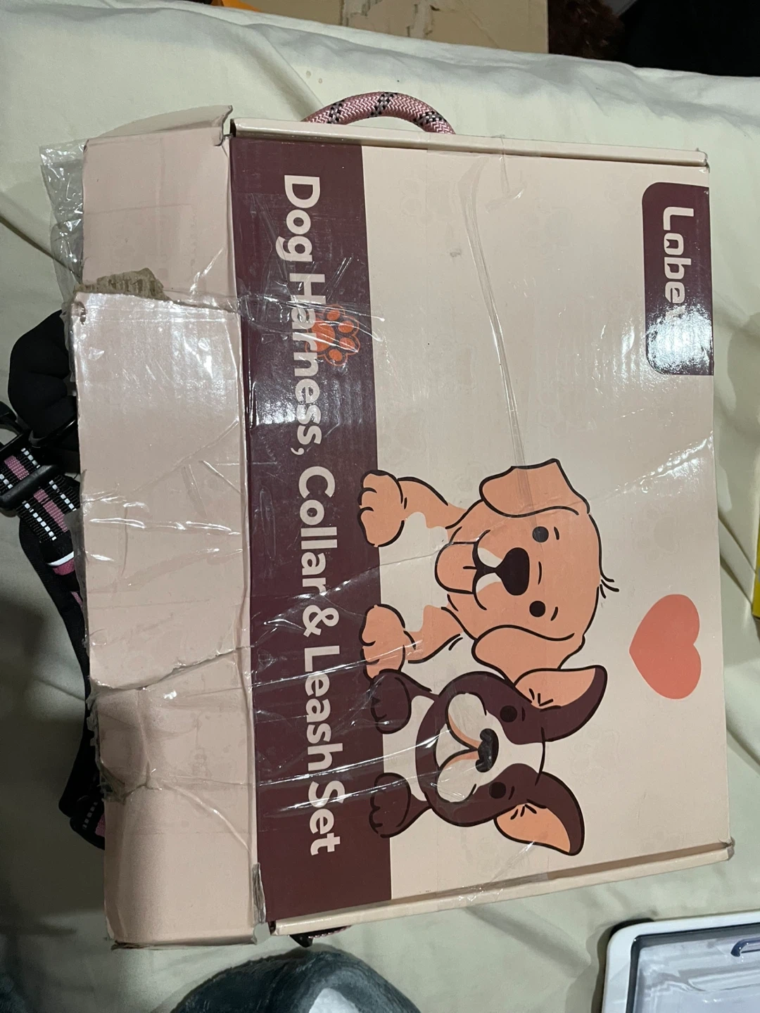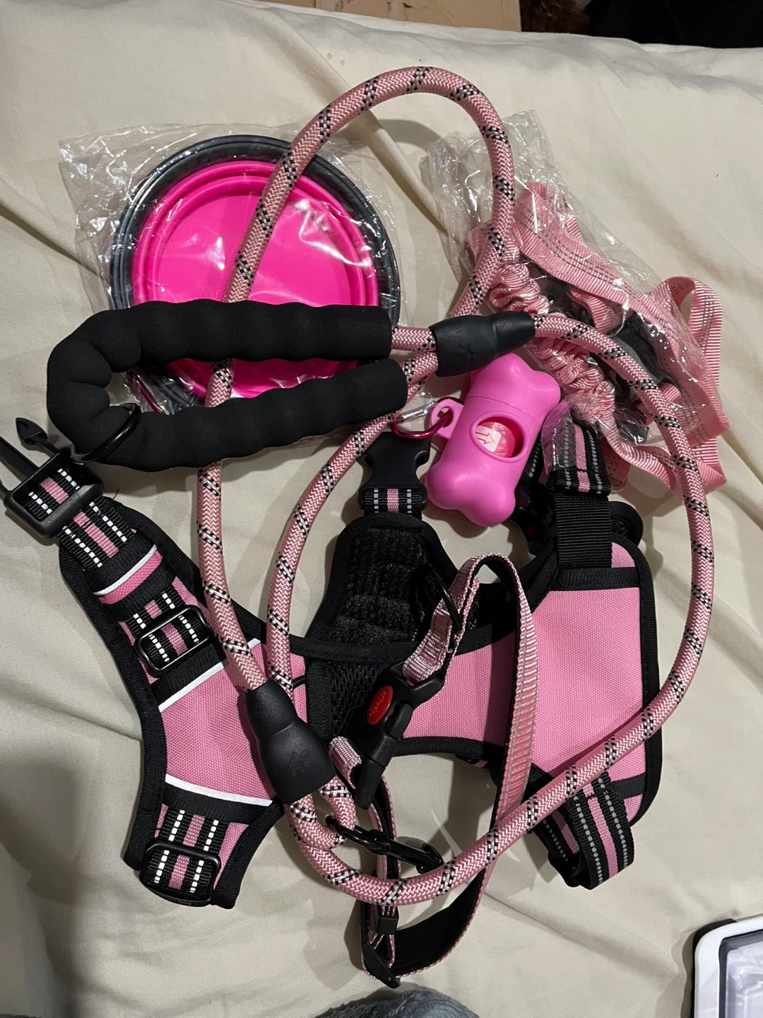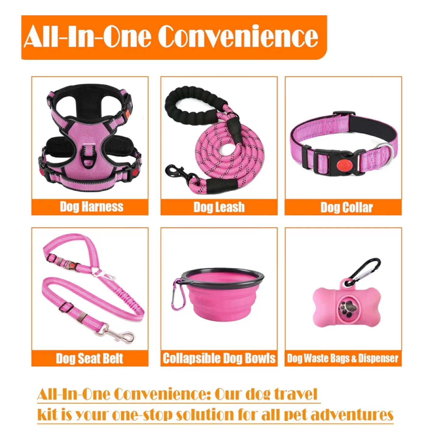 70Complete dog walking set in pink! Includes: - Dog harness - Dog leash - Dog collar - Dog seat belt - Collapsible dog bowls - Dog waste bags & dispenser Perfect for training, walking, and hiking! Fits medium dogs. Comes with the original box