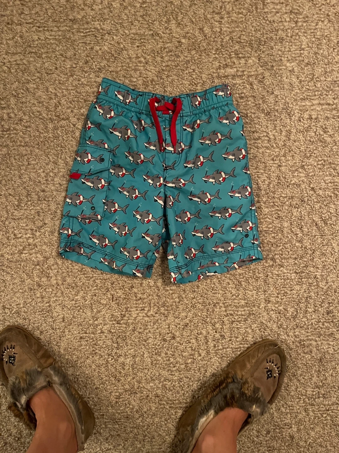 These adorable Hatley swim trunks are perfect for your little one! They're a size 4 and feature a fun shark pattern. The trunks have a comfortable elastic waistband with a red drawstring. Great for the pool or beach