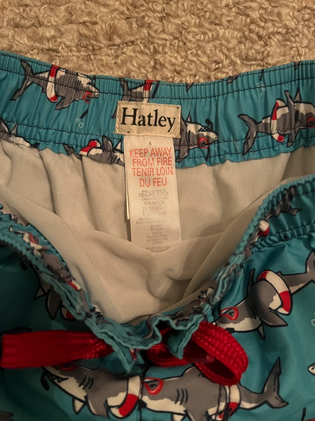 These adorable Hatley swim trunks are perfect for your little one! They're a size 4 and feature a fun shark pattern. The trunks have a comfortable elastic waistband with a red drawstring. Great for the pool or beach