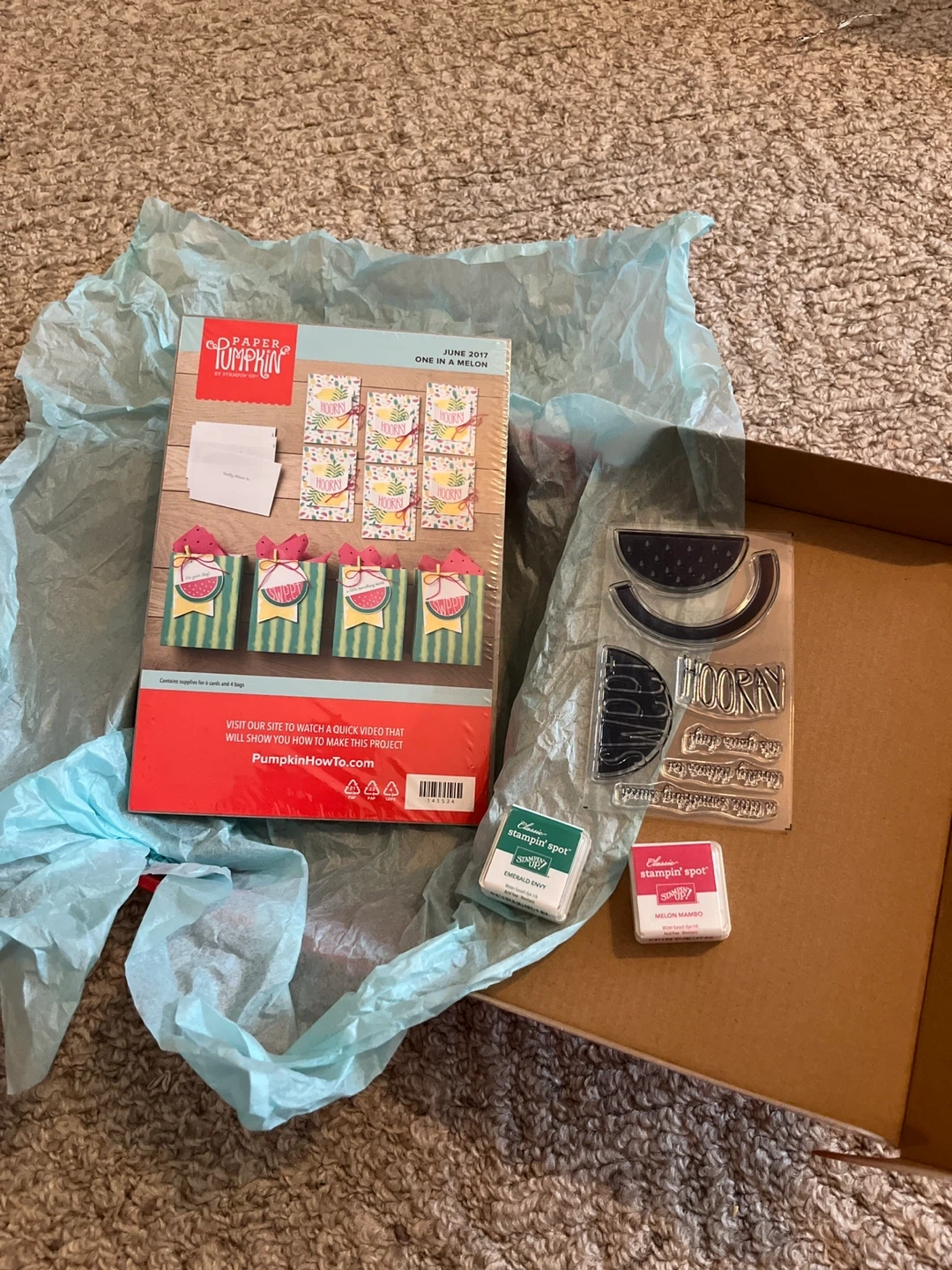 Selling a Paper Pumpkin June 2017 'One in a Melon' kit! It includes supplies for cards and bags, along with classic Stampin' Spot ink pads in Emerald Envy and Melon Mambo. Perfect for your crafting projects!