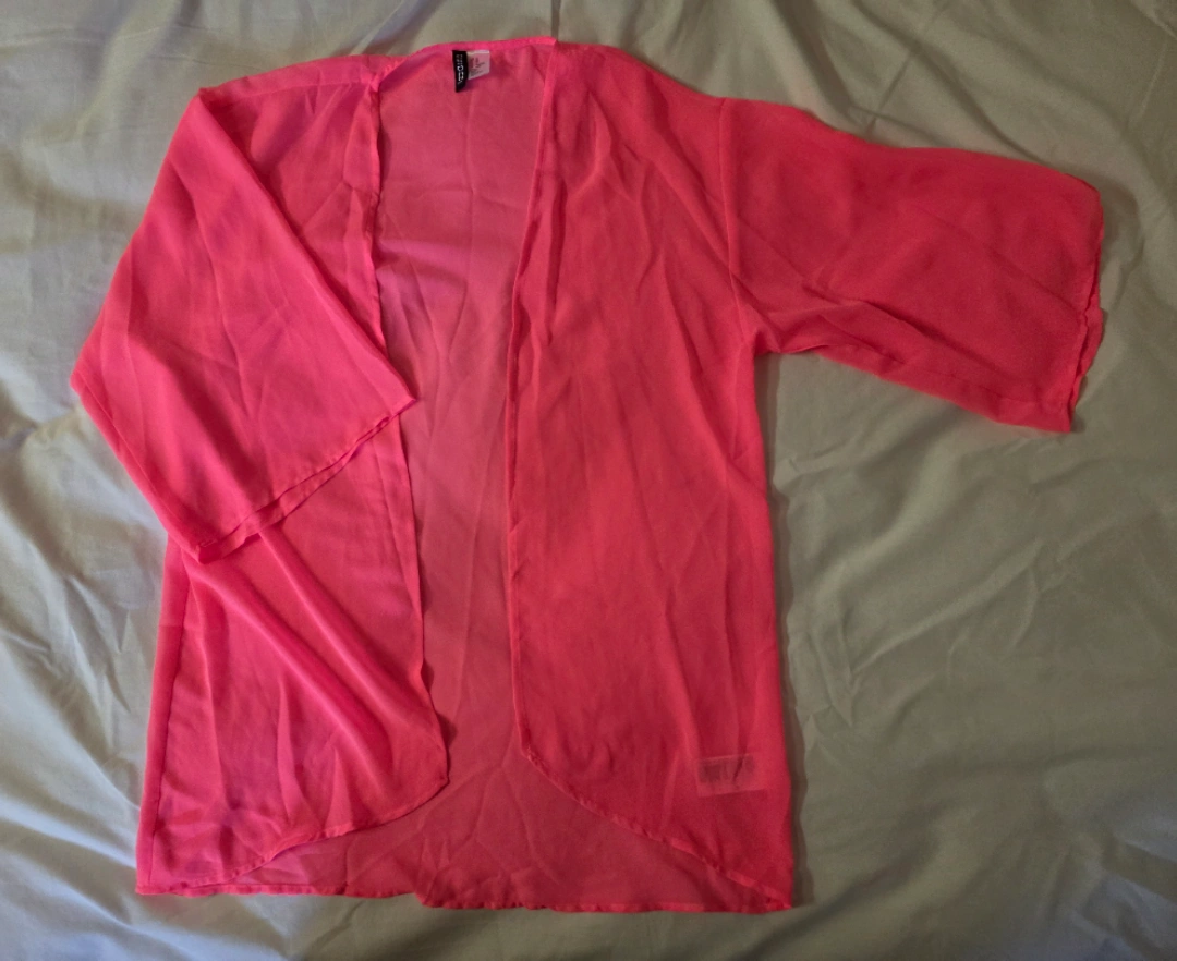 Momma is updating her wardrobe. Bright pink kimono from H&M's Divided. Size XS. This lightweight piece is perfect for layering or adding a pop of colour to any outfit.