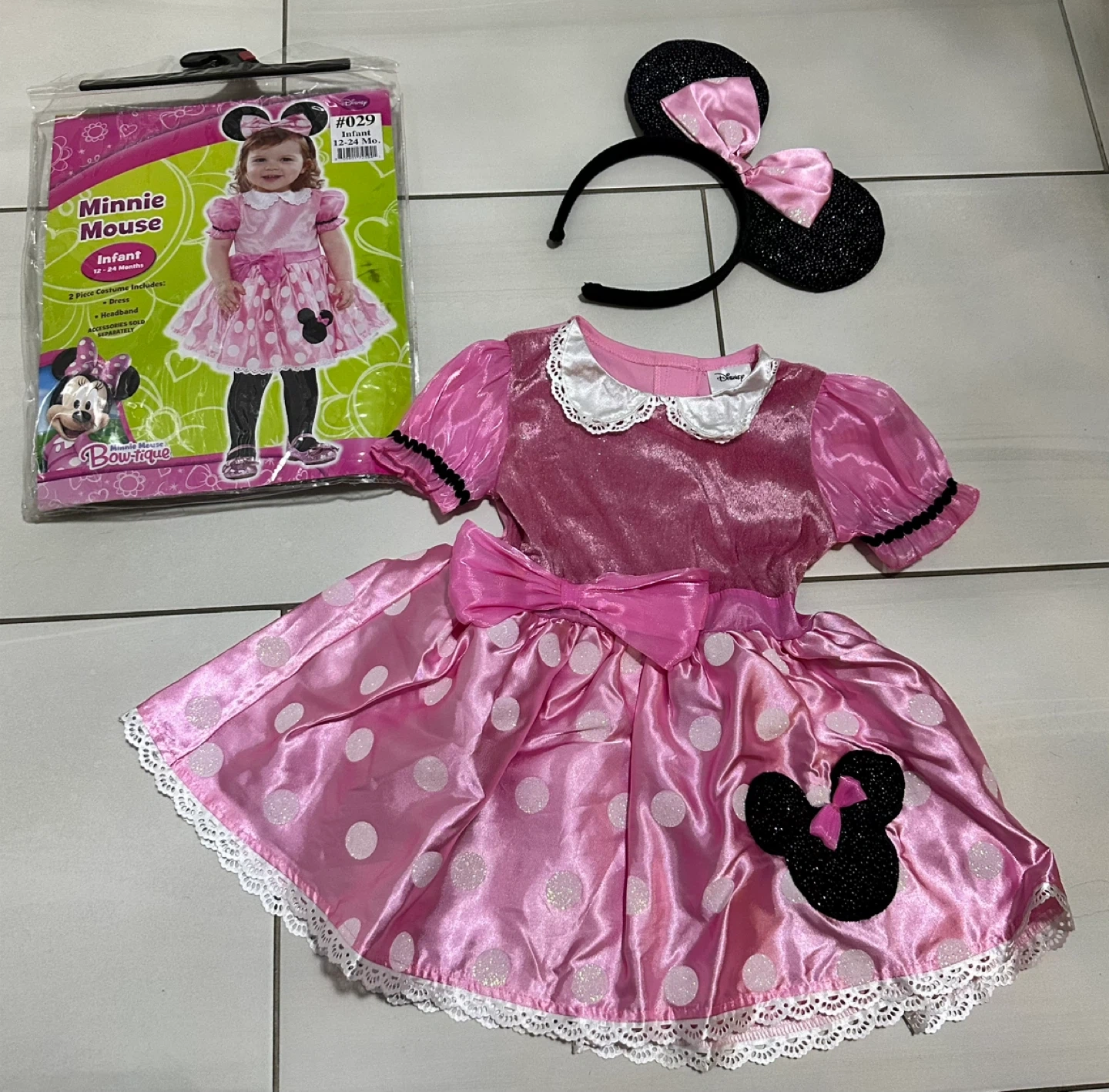 Selling a super cute Disney Minnie Mouse costume for infants! It's sized for 12-24 months. The 2-piece costume includes the dress and headband. Perfect for dress-up or Halloween!
