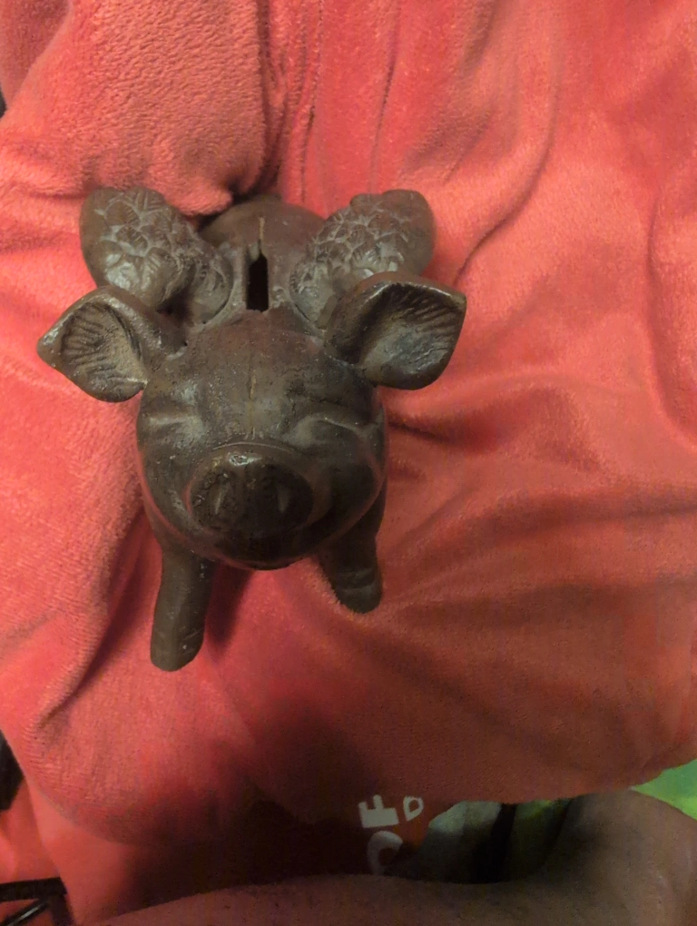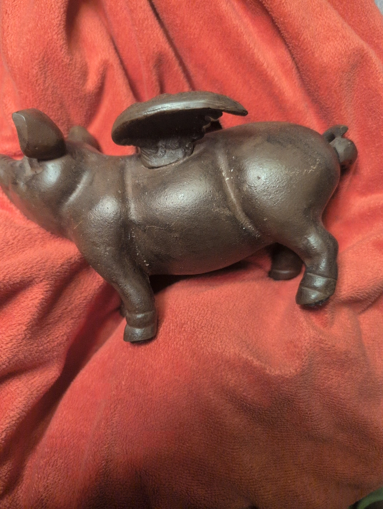 Selling a cute flying pig piggy bank! It's a charming addition to any room, with its detailed design and rustic finish. It's in great condition and ready to be your new coin collector