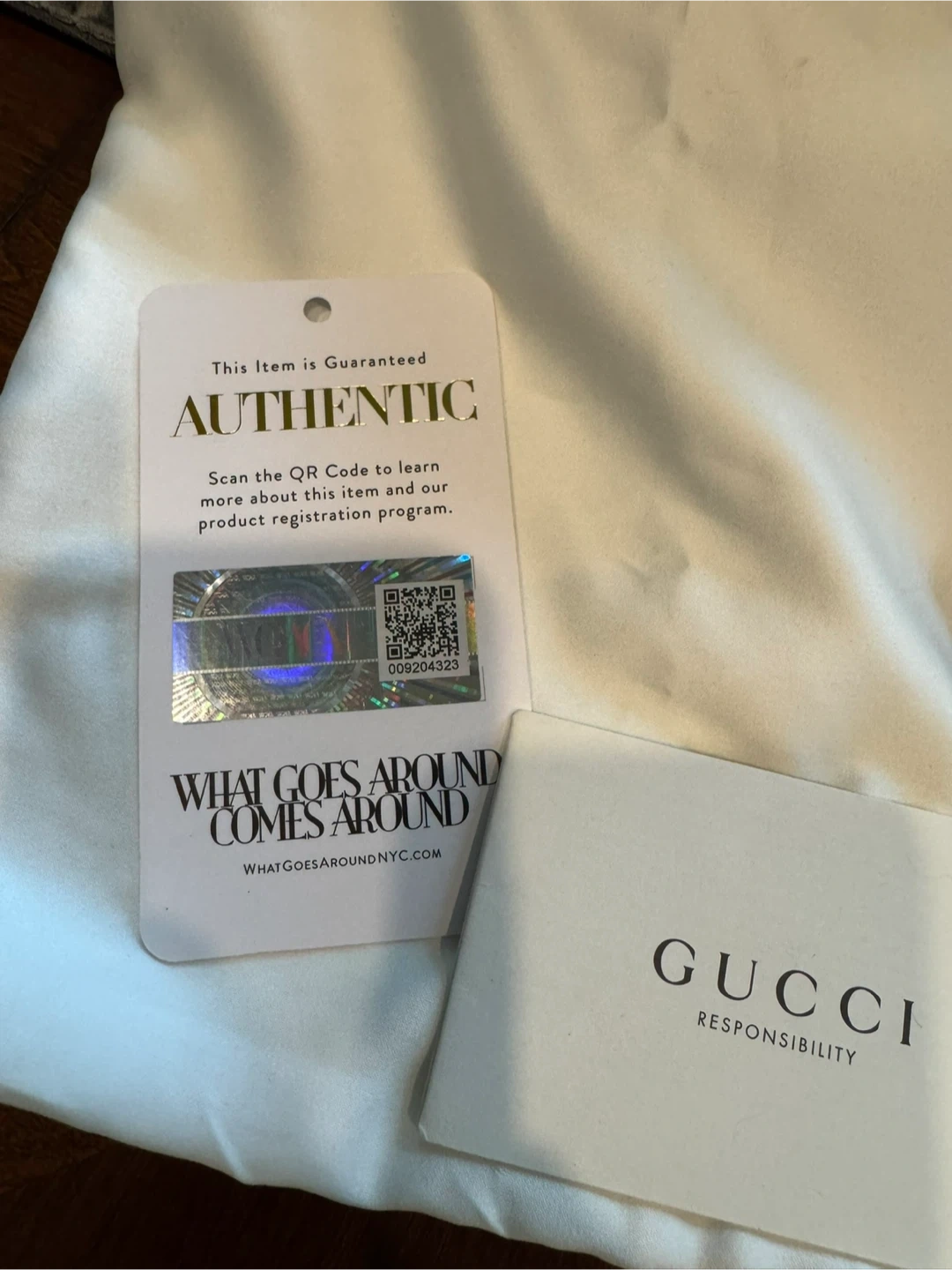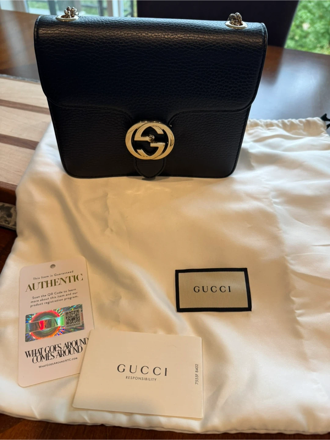 Selling a beautiful Gucci shoulder bag in black leather! It's in great condition and comes with its original dust bag and authenticity card. Used twice bought brand new 2 years ago. The iconic Gucci logo is featured prominently on the front.