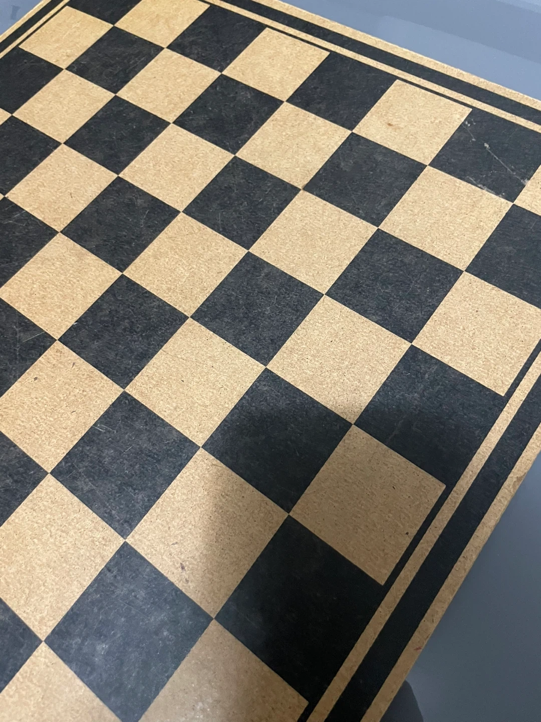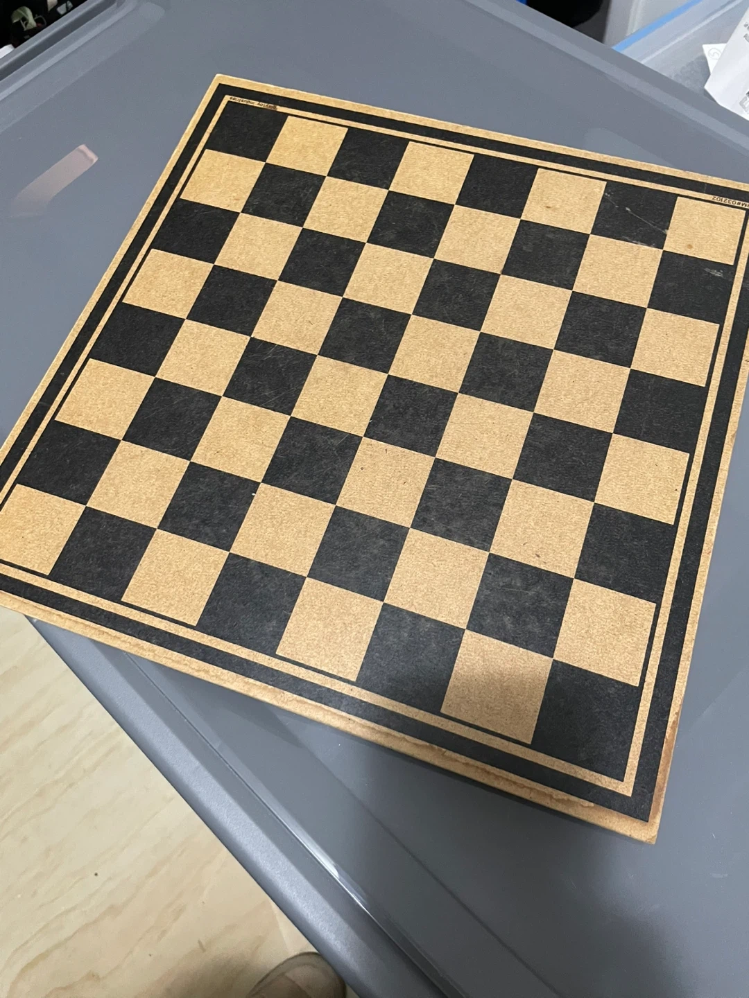 Selling a game board that can be used for checkers or chess. Black and tan squares. It's in used condition, as shown in the photos. Perfect for a fun game!