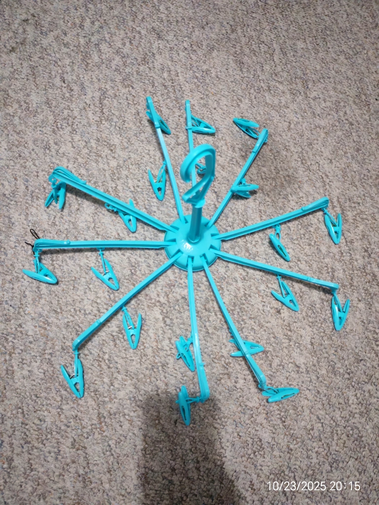 Selling a handy blue laundry drying rack! It's perfect for small spaces and delicate items. The clips are great for socks, underwear, or baby clothes. It's lightweight and easy to store when not in use