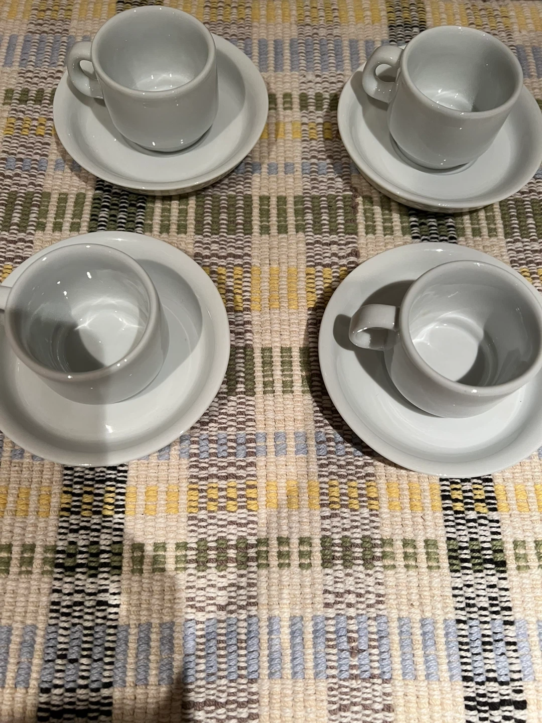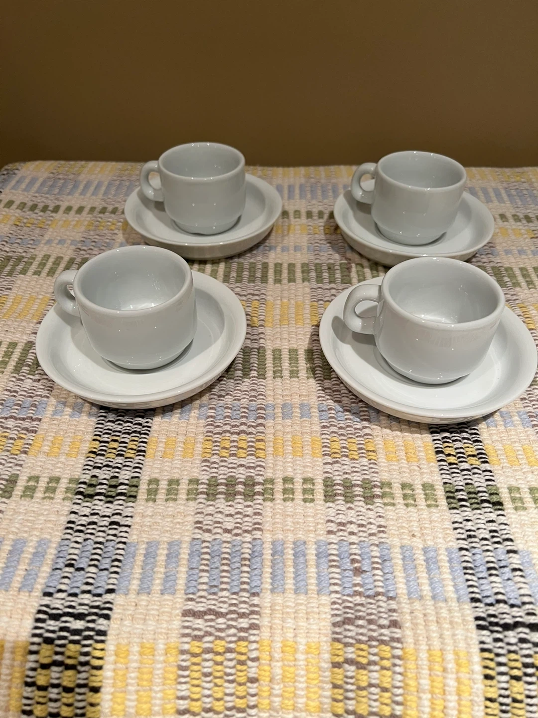 178Selling a set of four white espresso cups and saucers. They're in great condition and perfect for your morning coffee or tea! They are a simple and elegant design that fits any kitchen style