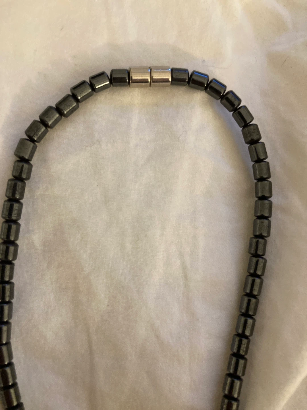 186Selling a hematite necklace with a round pendant. The necklace is made of small, cube-shaped hematite beads, and it features a circular pendant. It's in great condition and ready to wear! Magnetic closure