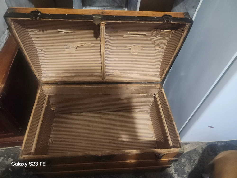 10Selling a vintage wooden steamer trunk! It's perfect for storage or as a unique decorative piece. The trunk has a classic design with metal accents and a spacious interior. It shows some signs of wear consistent with its age, adding to its antique charm