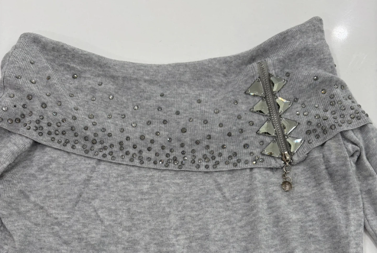 43Selling an off-shoulder sweater. Never worn. It's a size S/M and features cute embellishments around the neckline and on the sleeves. The sweater is a soft grey colour and has a decorative zipper detail on the front. Perfect for adding a bit of sparkle to your wardrobe! Made in Italy