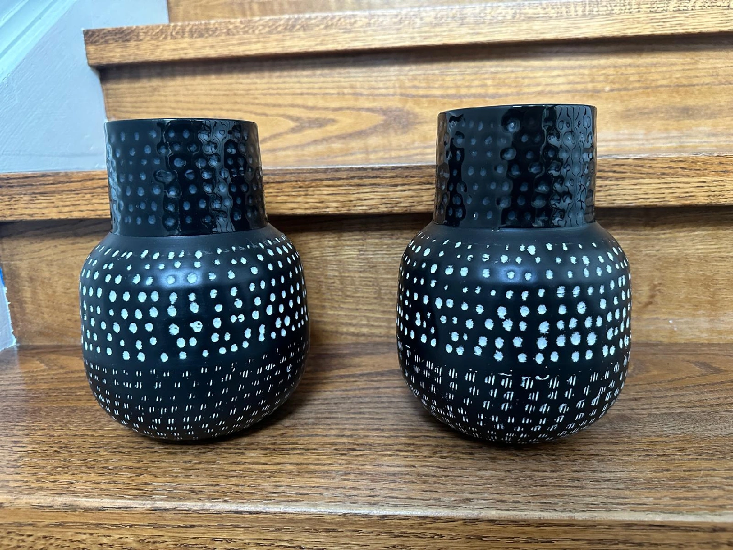 Selling a decorative vase from HomeSense! It's black with white polka dots and stripes. Perfect for adding a touch of style to your home decor. It was originally priced at $14.99.