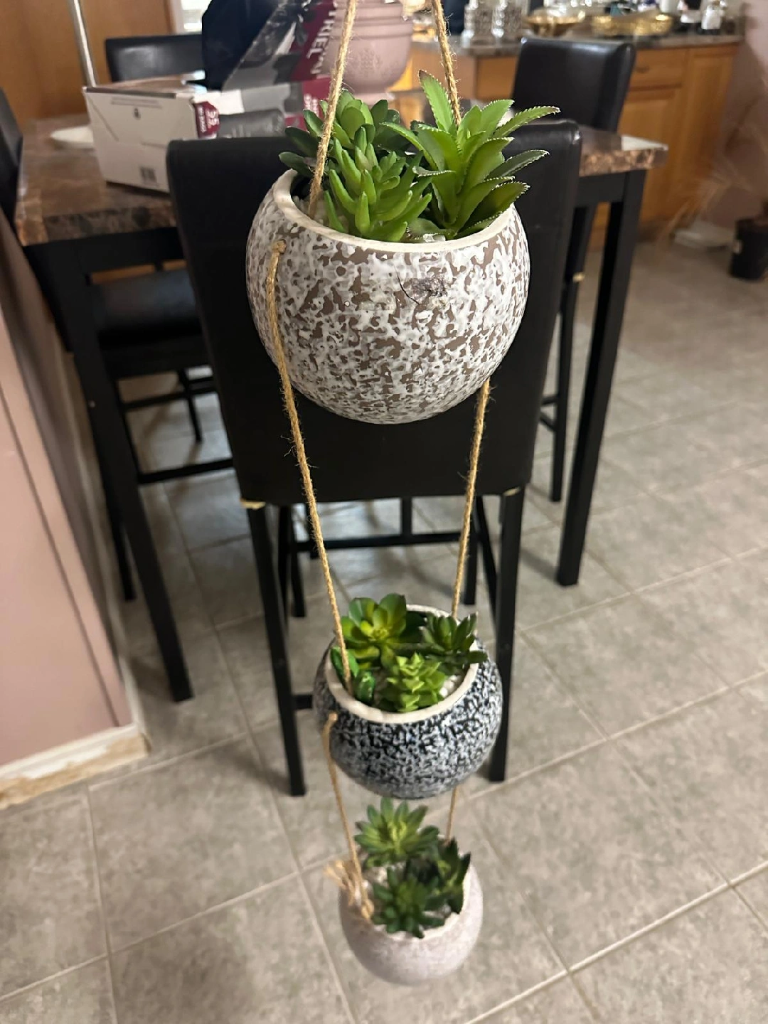 Cute hanging planter featuring three tiers of artificial succulents! It's perfect for adding a touch of greenery to any room without the hassle of watering. The planters have a speckled design in neutral tones, making it easy to match with your existing decor
