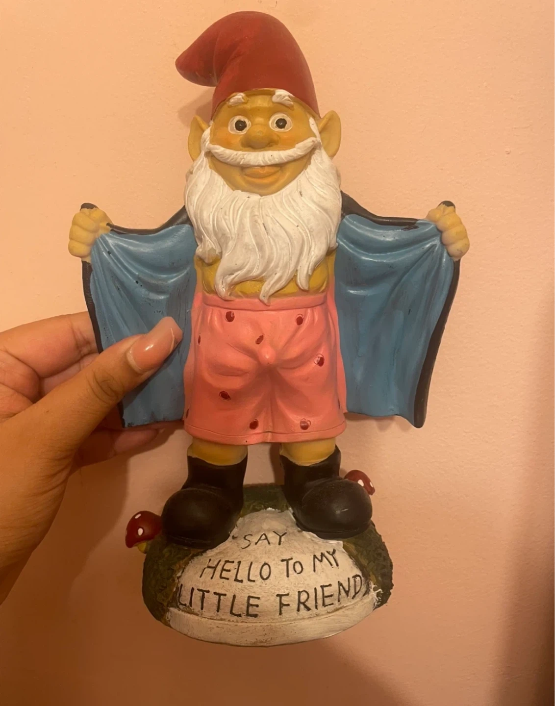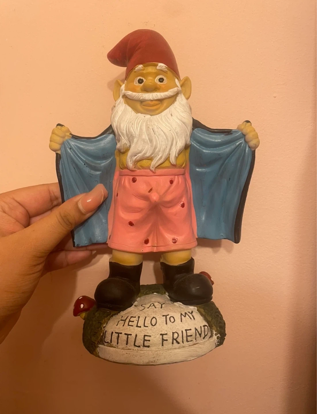 1000+This quirky garden gnome is ready to greet your guests! It's got a unique design that's sure to be a conversation starter. The gnome features a red hat, white beard, and a fun saying on the base: "Say hello to my little friend"