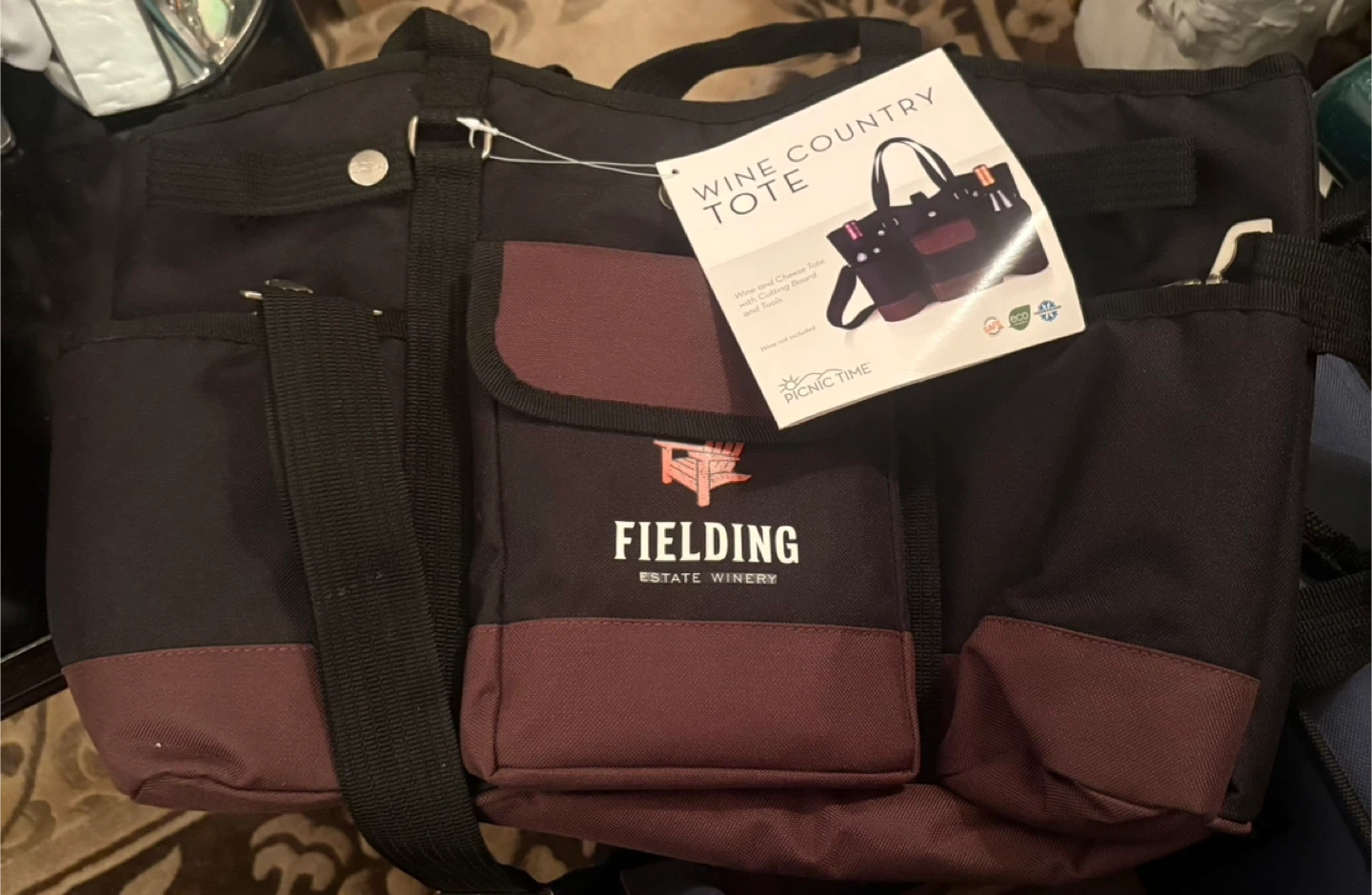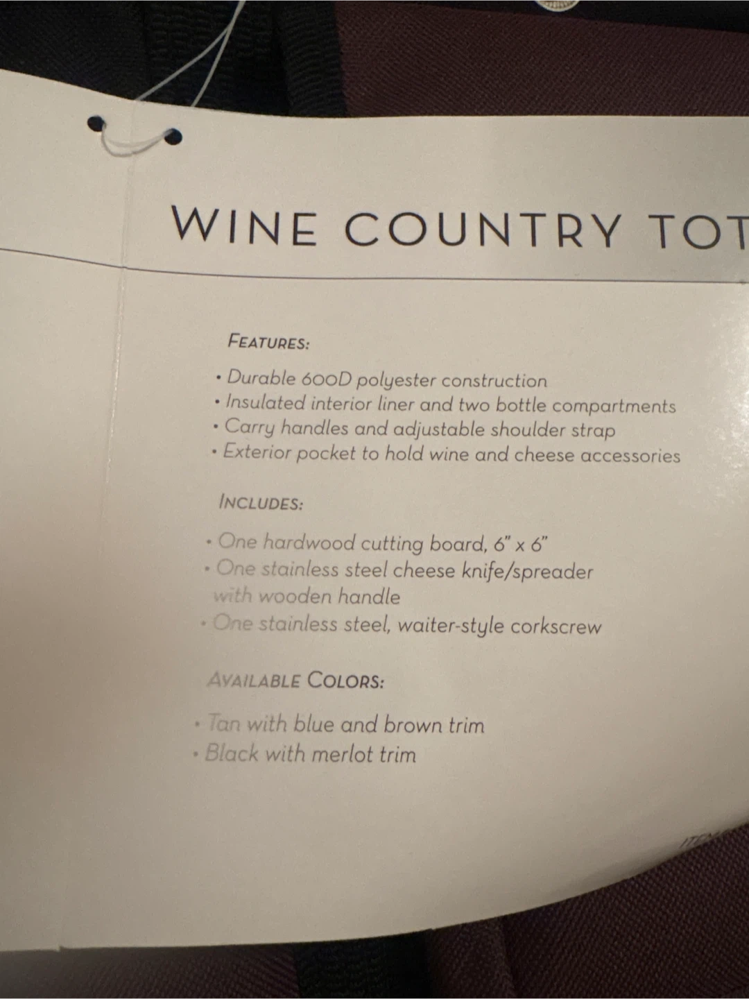 This is a Fielding Estate Winery Wine Country Tote in black with merlot trim. It features durable 600D polyester construction, an insulated interior liner, and two bottle compartments. Also includes a hardwood cutting board (6" x 6"), a stainless steel cheese knife/spreader with a wooden handle, and a stainless steel waiter-style corkscrew