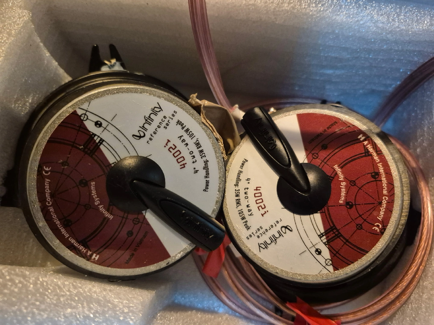 Selling a pair of Infinity Reference Series 4002i 4" 2-way speakers. They are in great condition and come with the original box! These speakers have a power handling of 35W RMS and 105W peak. Perfect for upgrading your car's audio system 2 1inch tweeters with crossovers also.