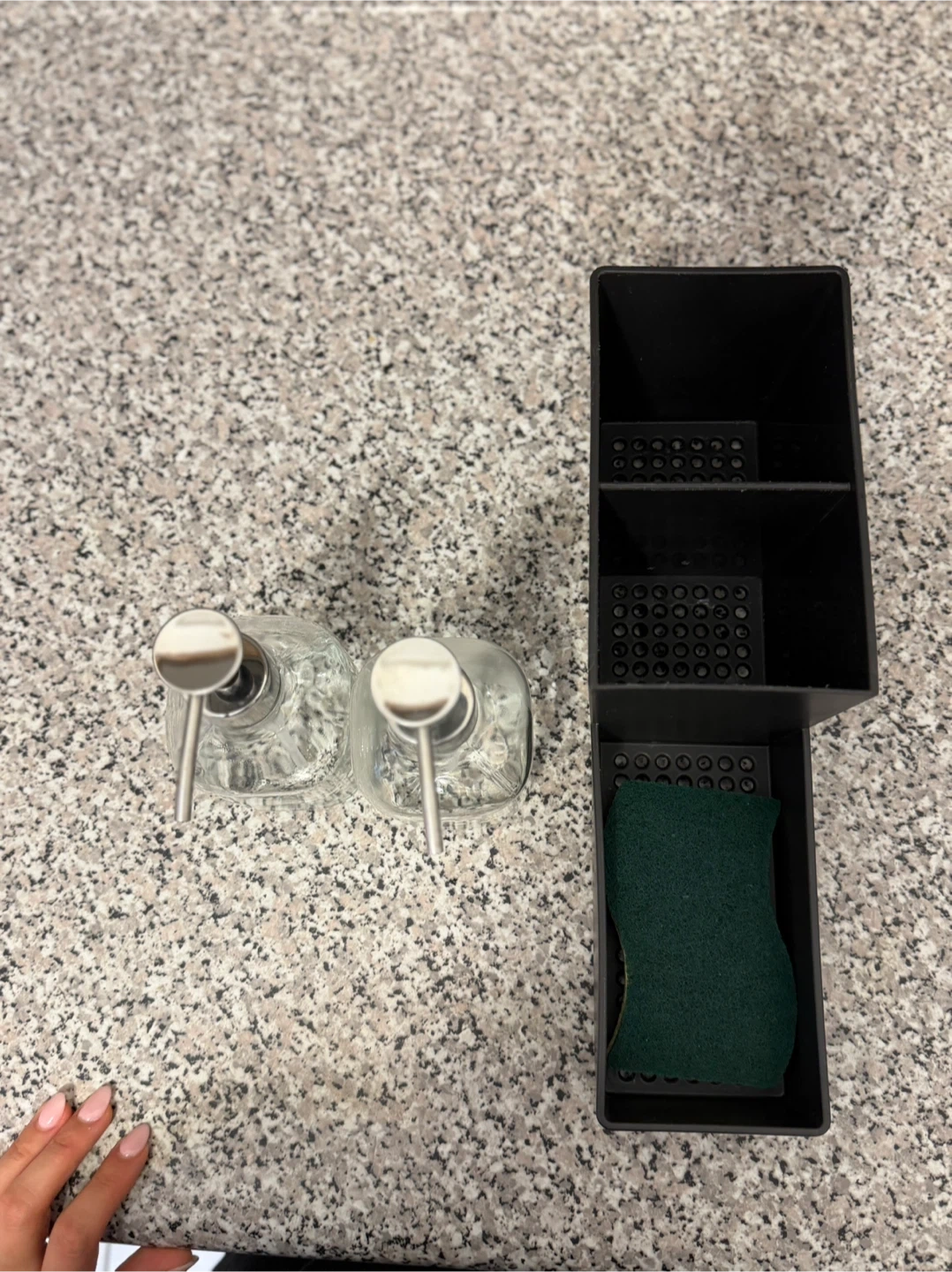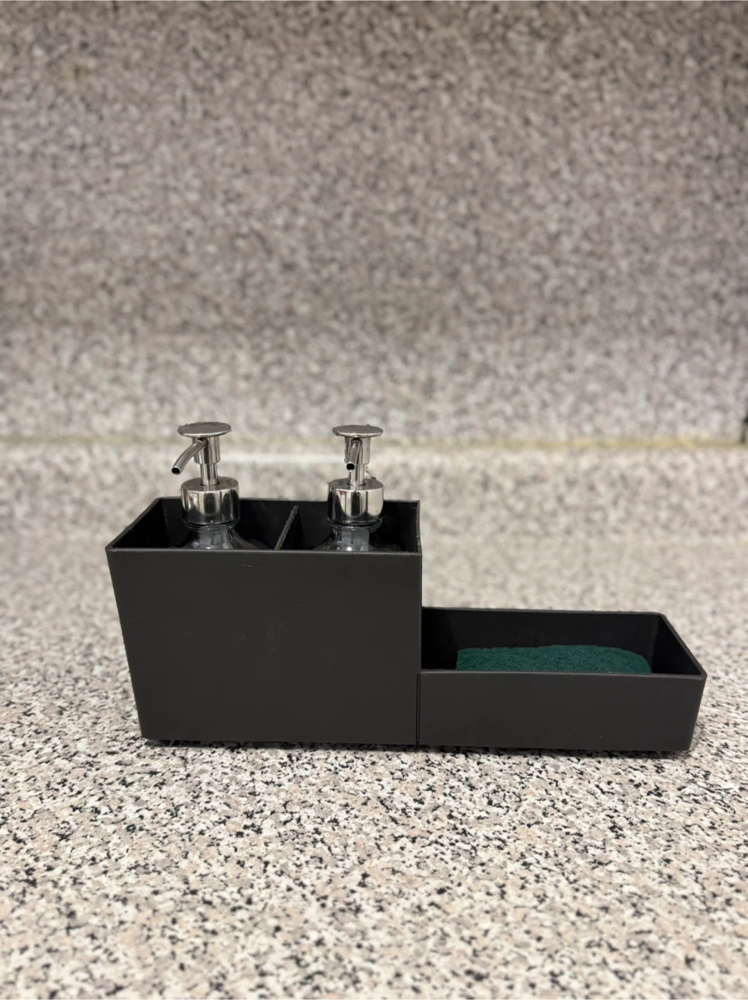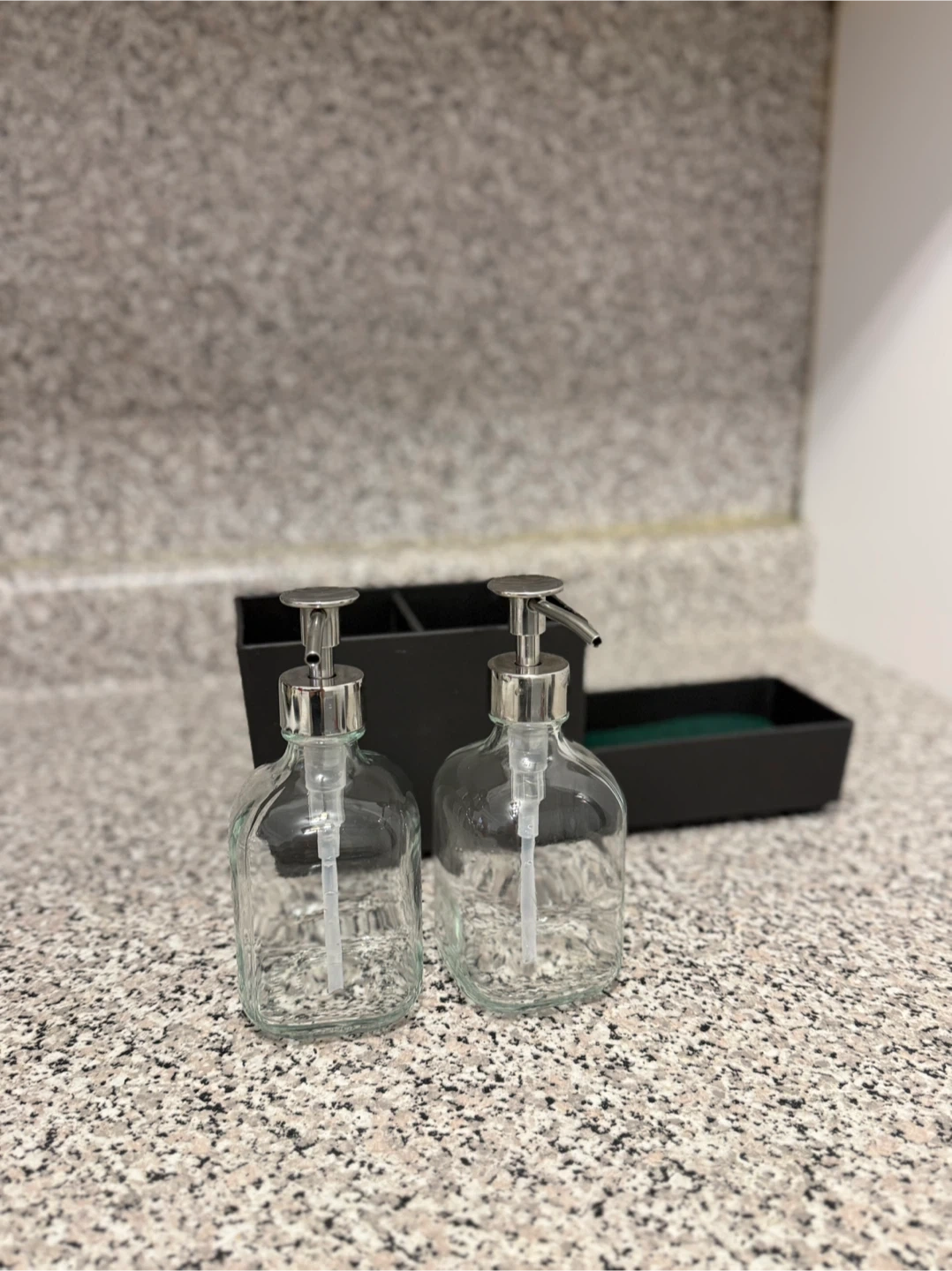 75Selling a soap dispenser set with a tray! This set comes with two clear glass soap dispensers and a black tray to keep everything organized. Perfect for your kitchen or bathroom sink!