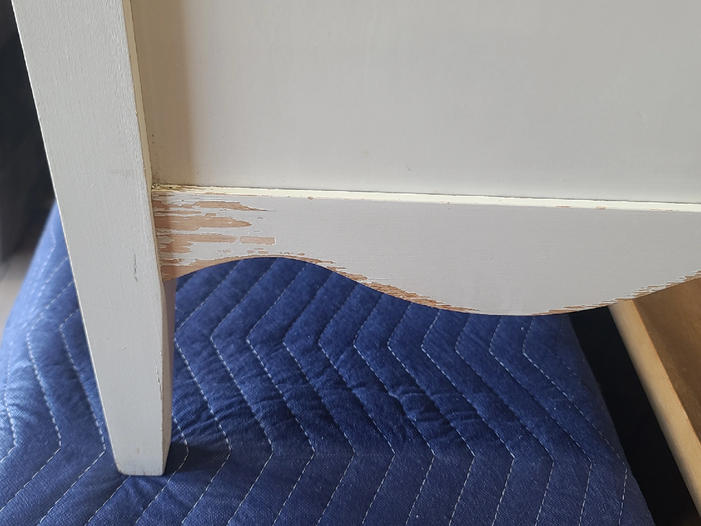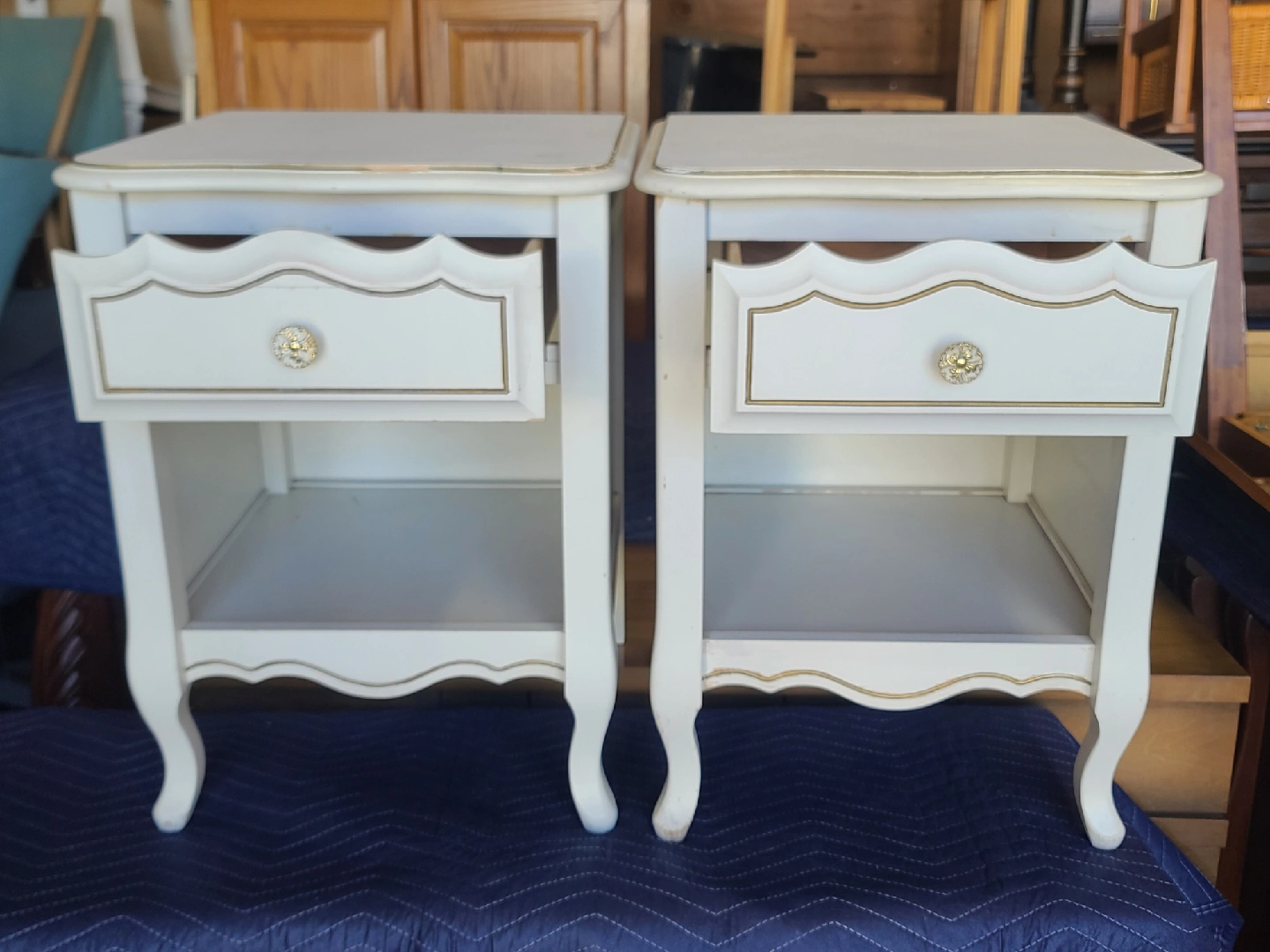 A pair of nightstands. They are white with gold trim and have a drawer and a shelf. There are some scratches. Perfect for adding a touch of classic elegance to your bedroom. Measurements : 18 1/2" across front by 17 1/2" deep by 25" high. Delivery can be arranged. Viewing and pickup by appointment.