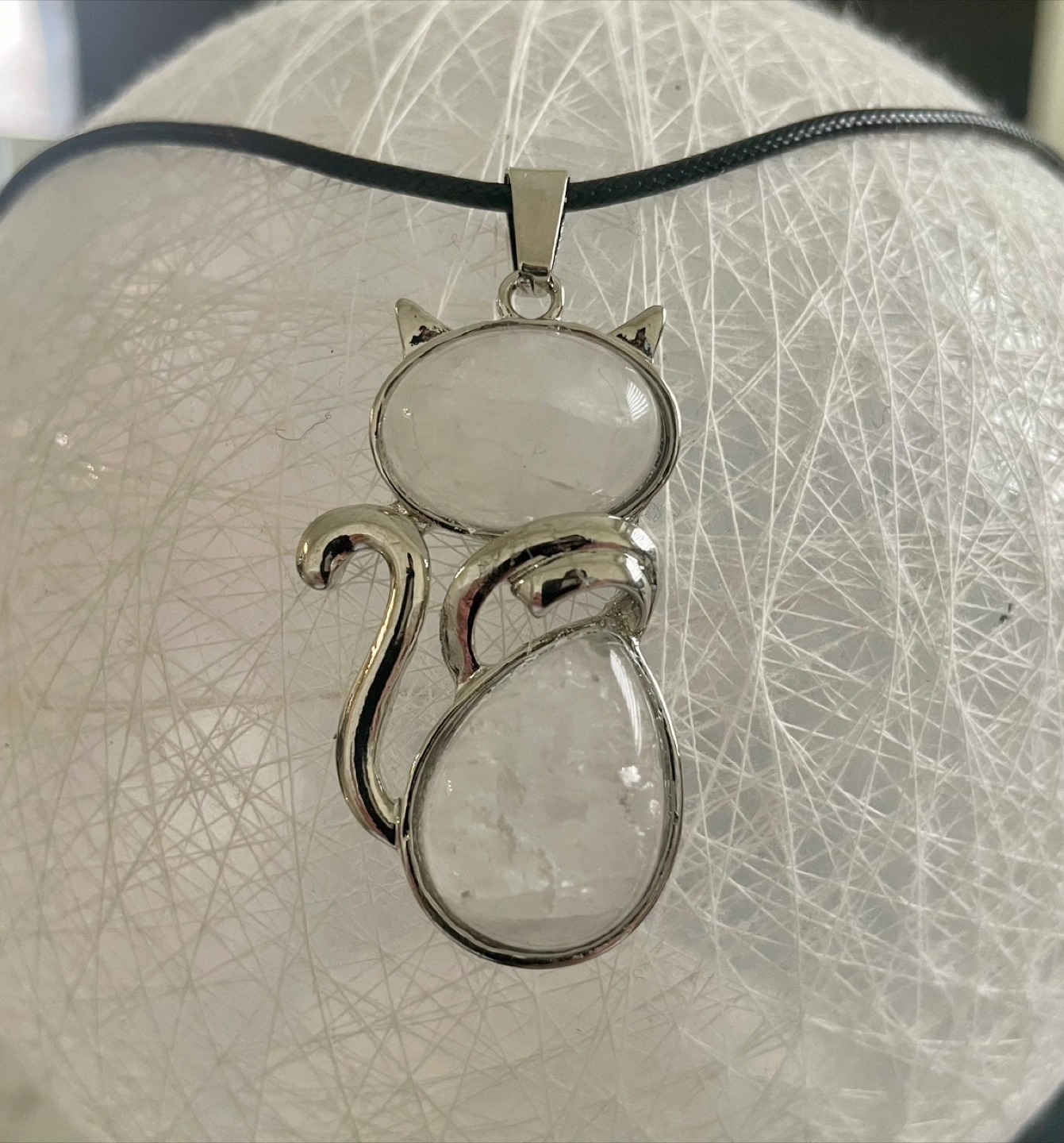 This is a cute cat-shaped necklace with 100% natural clear quartz stones. It features a silver-tone metal frame and a black cord. Clear quartz is known for its metaphysical properties like amplification, healing, and clarity.