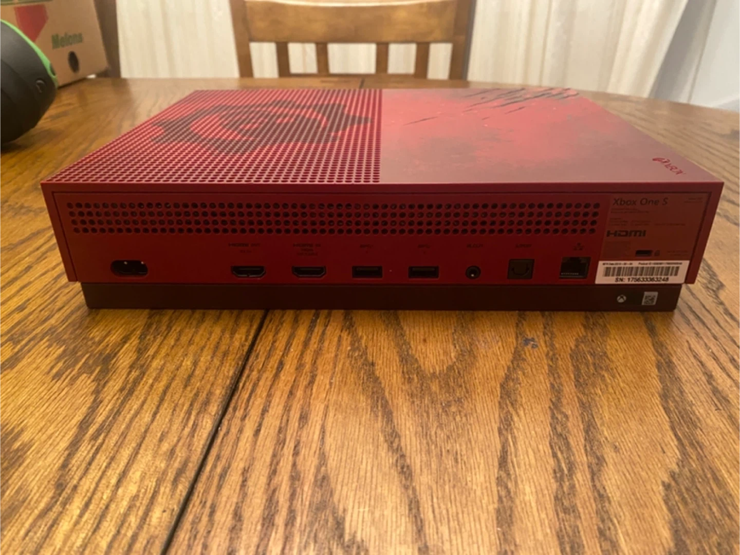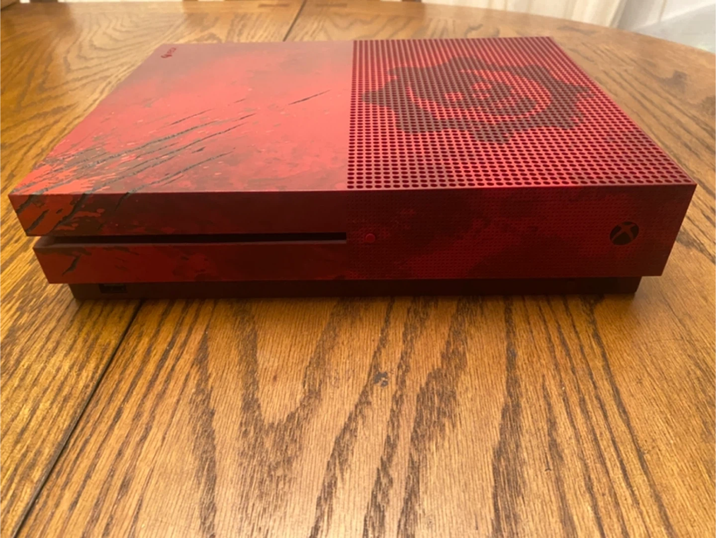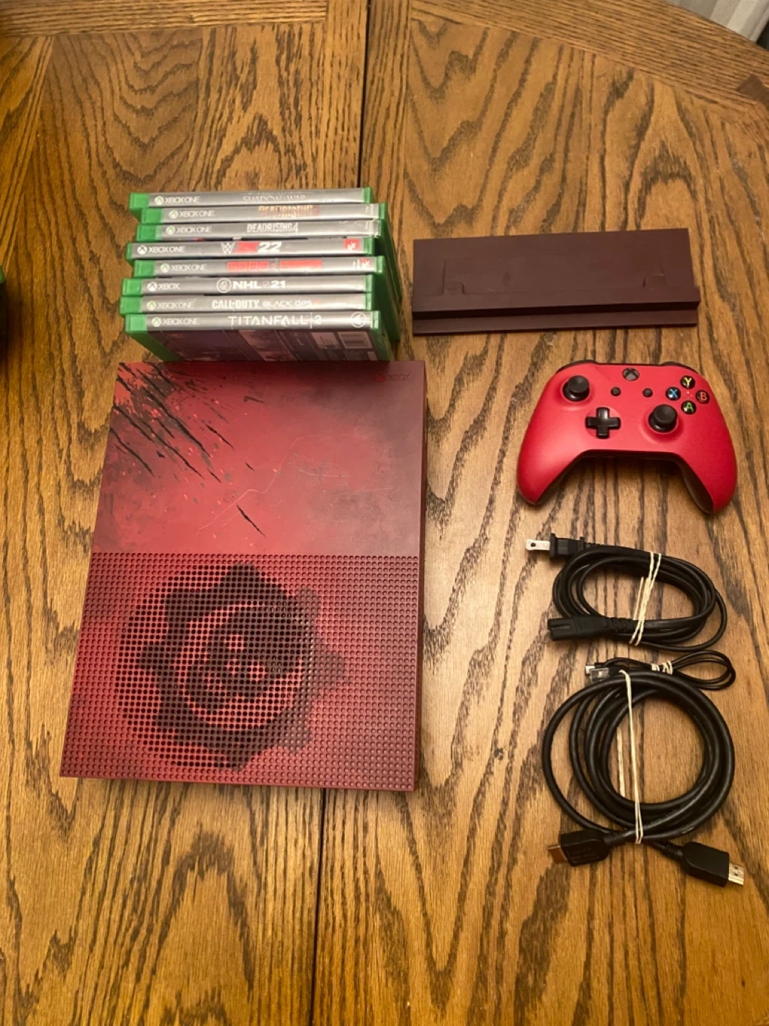 Selling an Xbox One S Gears of War edition in good condition. Includes red controller power cable, HDMI cable, Also comes with 7 games: Titanfall 2, Call of Duty Black Ops III, NHL 21, Evolve, WWE 2K22, Dead Rising 4, and Shadow of War
