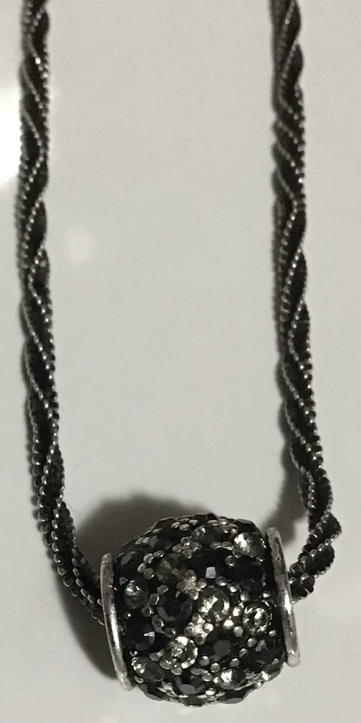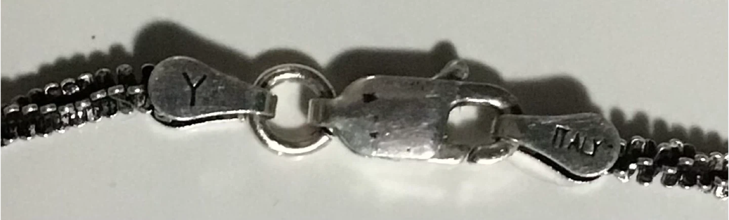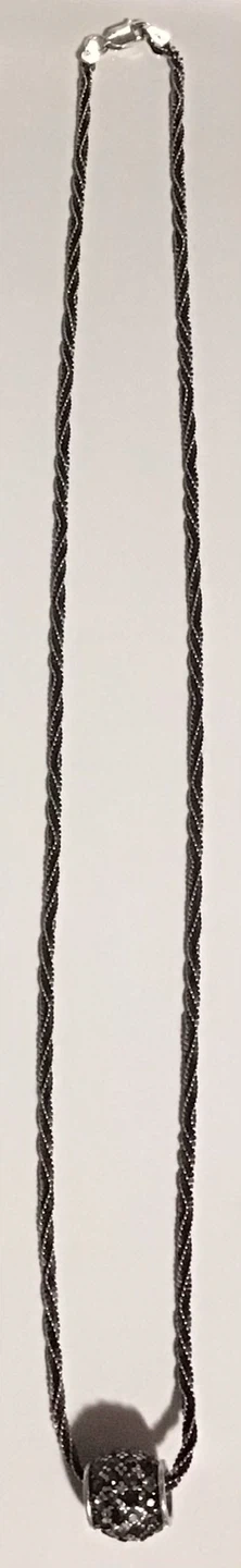 88Here's a stylish braided necklace with a silver tone finish! The clasp is marked with "Y" and "ITALY". It's in gently used condition and ready to add a touch of elegance to your outfit. $50.00 exact cash only, firm Small bills please Info in last photo Necklace & charm, as is Roughly 9 1/2 inches long Bought in jewelry store in Vegas Must go now