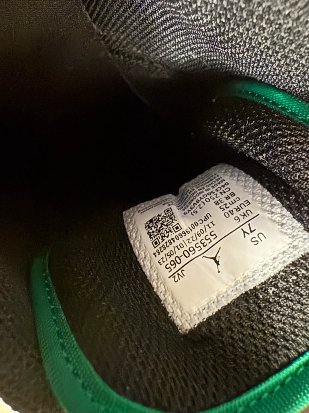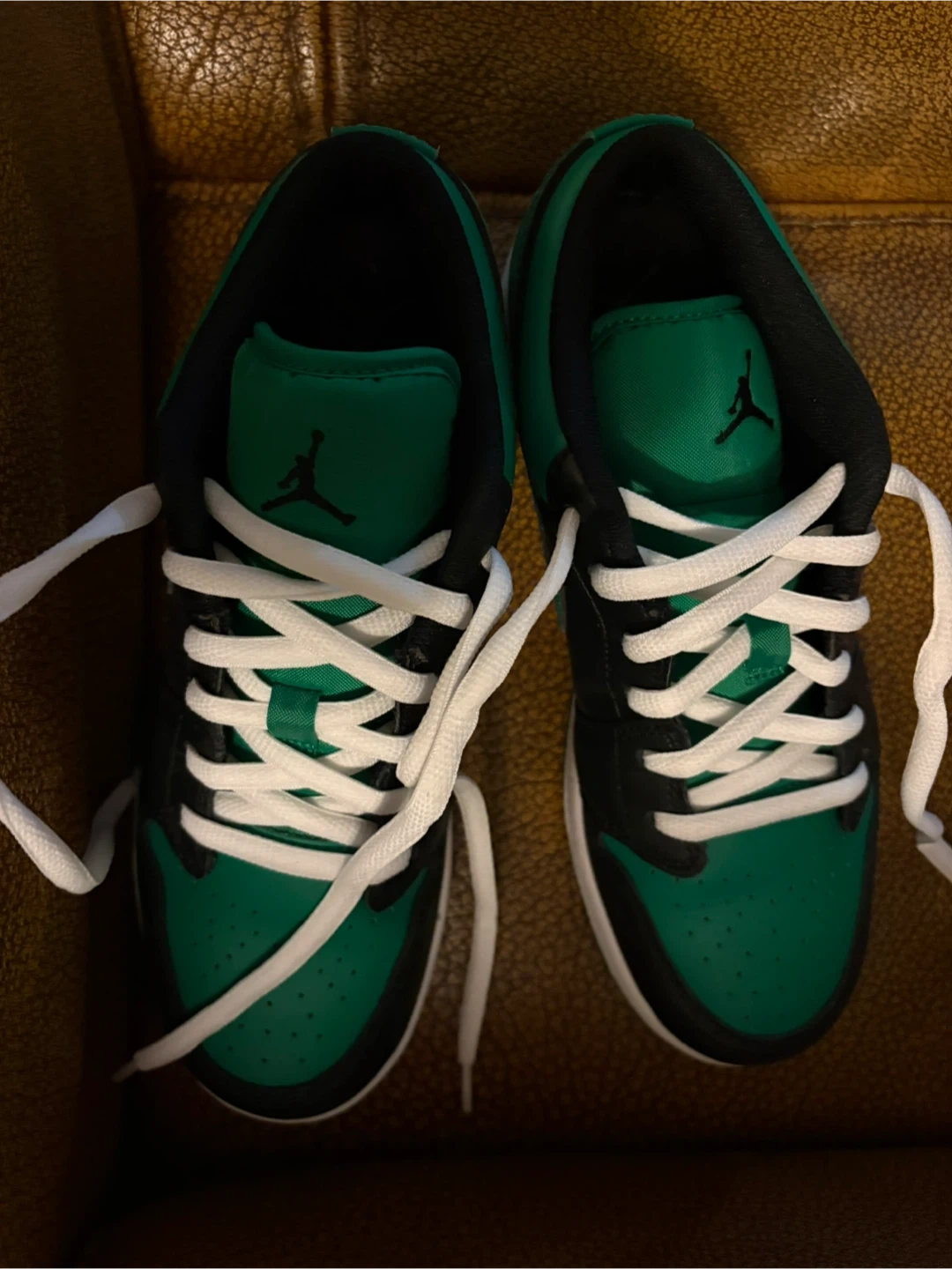 Selling a pair of Jordan 1 Lows in the Lucky Green colourway. They are a size 7Y. The manufacturing date on the tag is 2022 November 09. wore them once. i think i have original shoe laces( black )