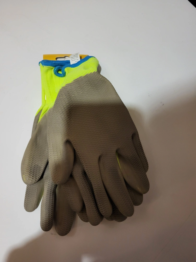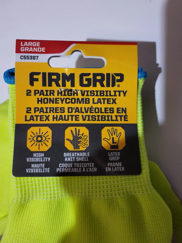 193I have a 2-pack of Firm Grip high visibility honeycomb latex gloves in size large. These gloves feature a breathable knit shell and a latex grip. Perfect for any job needing high visibility and a secure grip! I have 16 packs available.