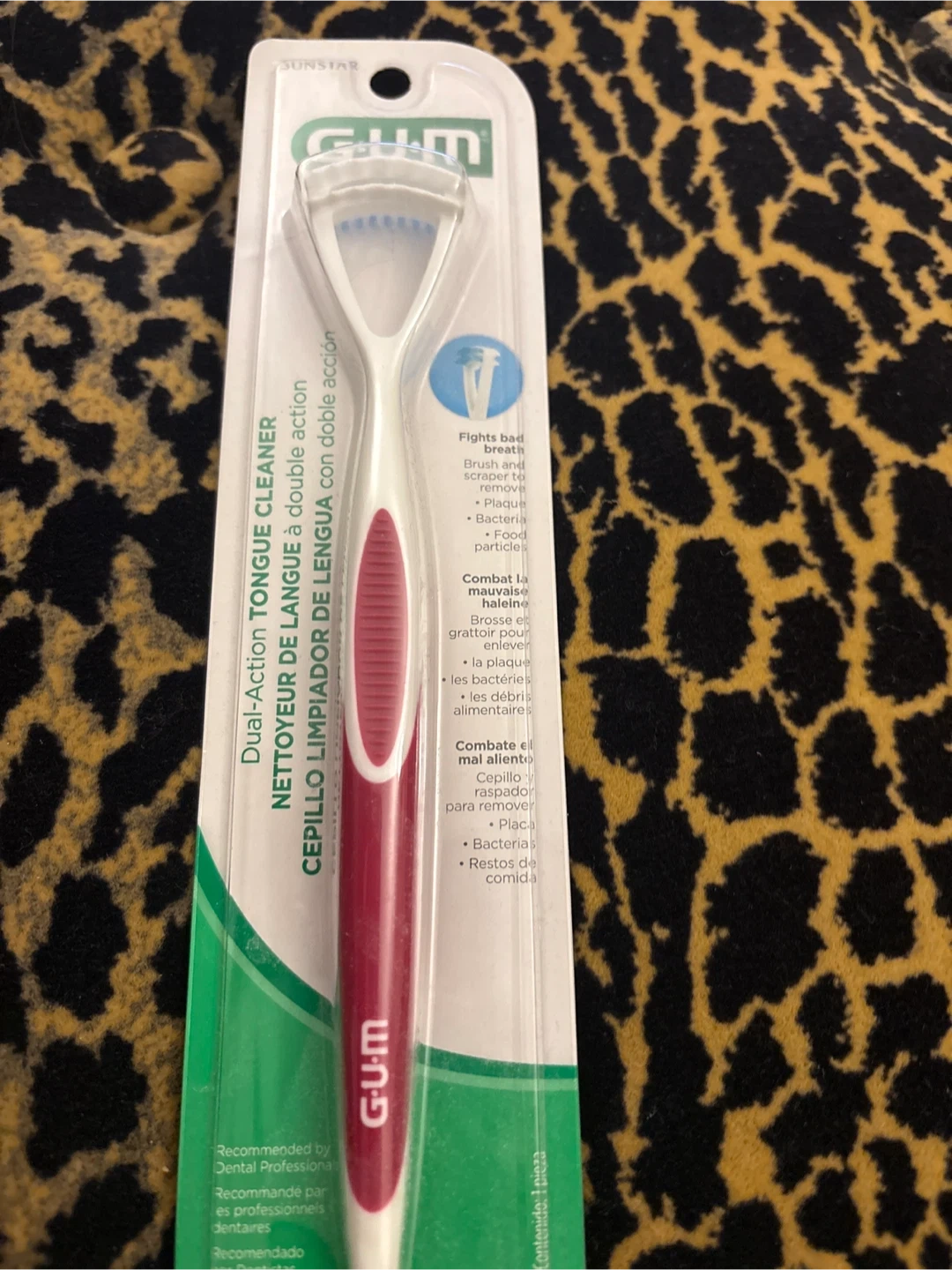 I'm selling a GUM Dual-Action Tongue Cleaner! It's a tongue cleaner with a brush and scraper to remove plaque, bacteria, and food particles. Recommended by dental professionals