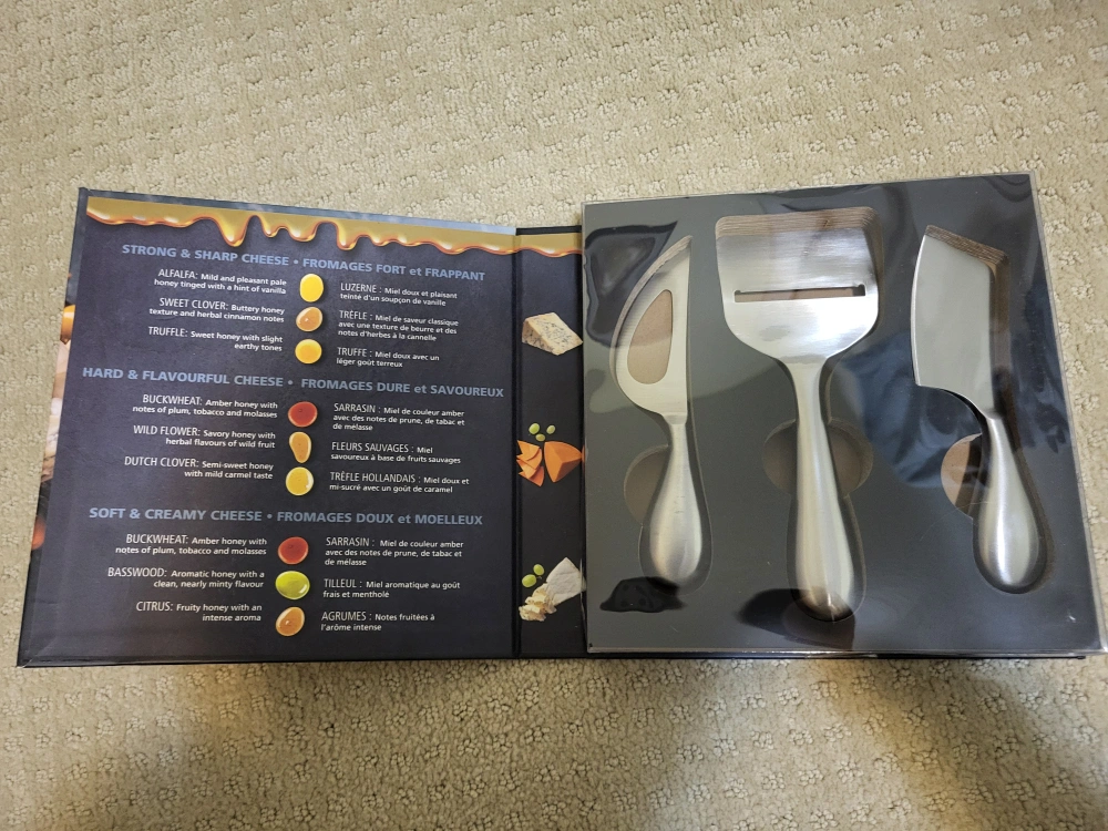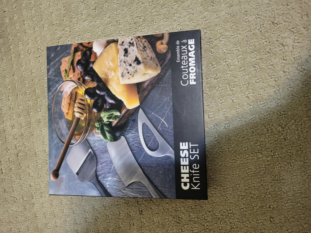 193Selling a cheese knife set in its original box! It includes the knives as shown in the pictures and the original packaging with descriptions of different cheeses. Perfect for your next cheese board night!