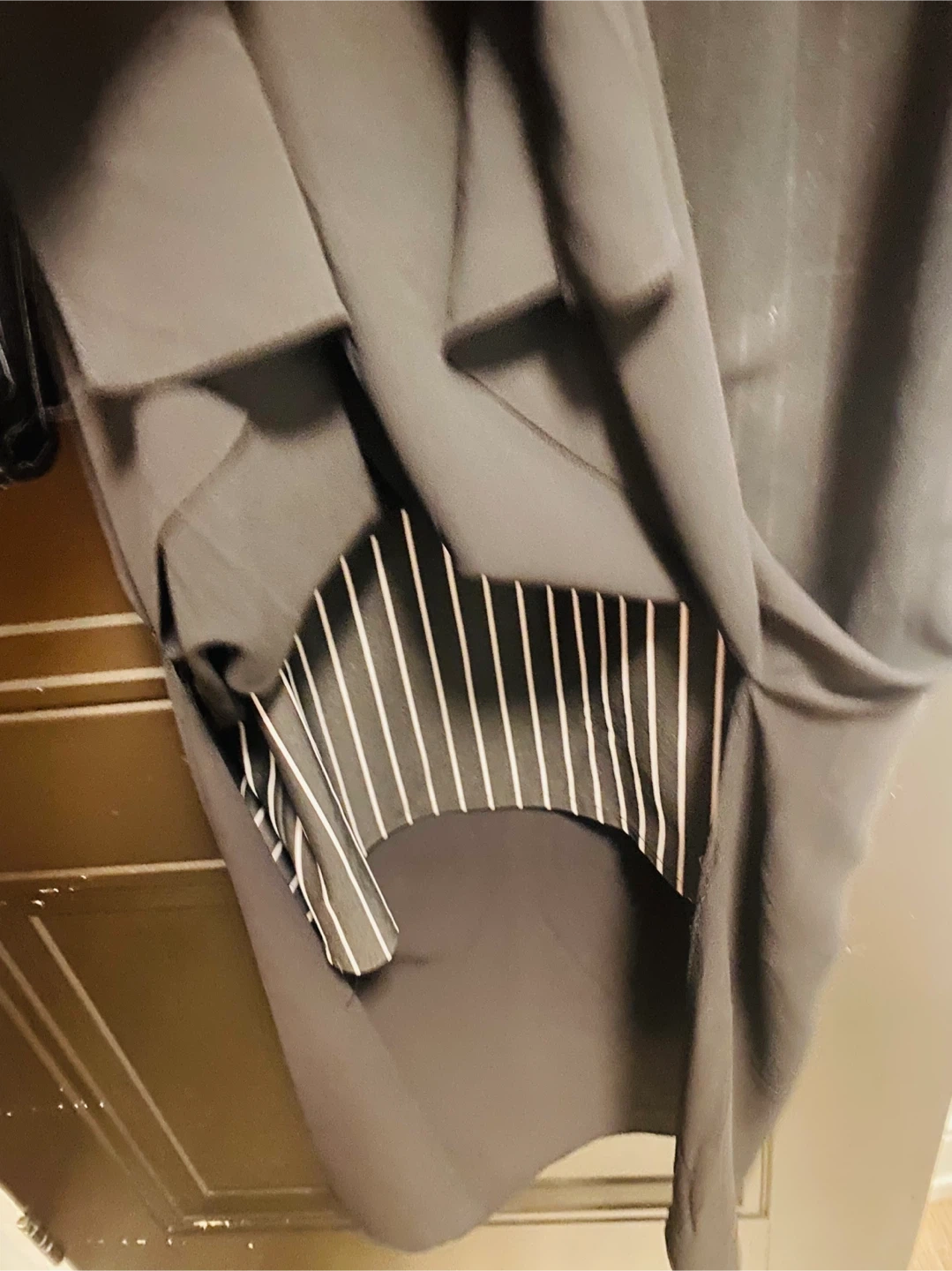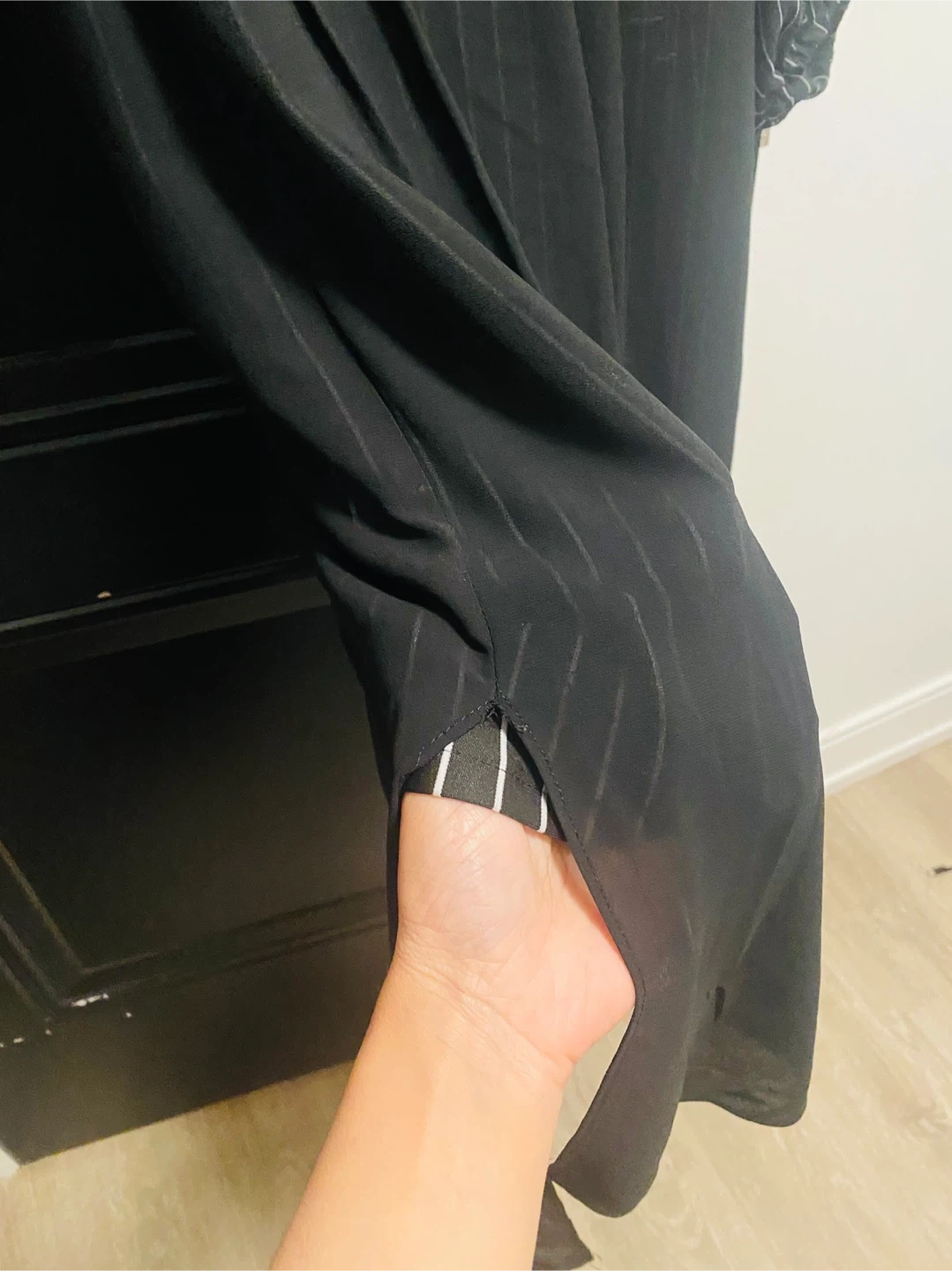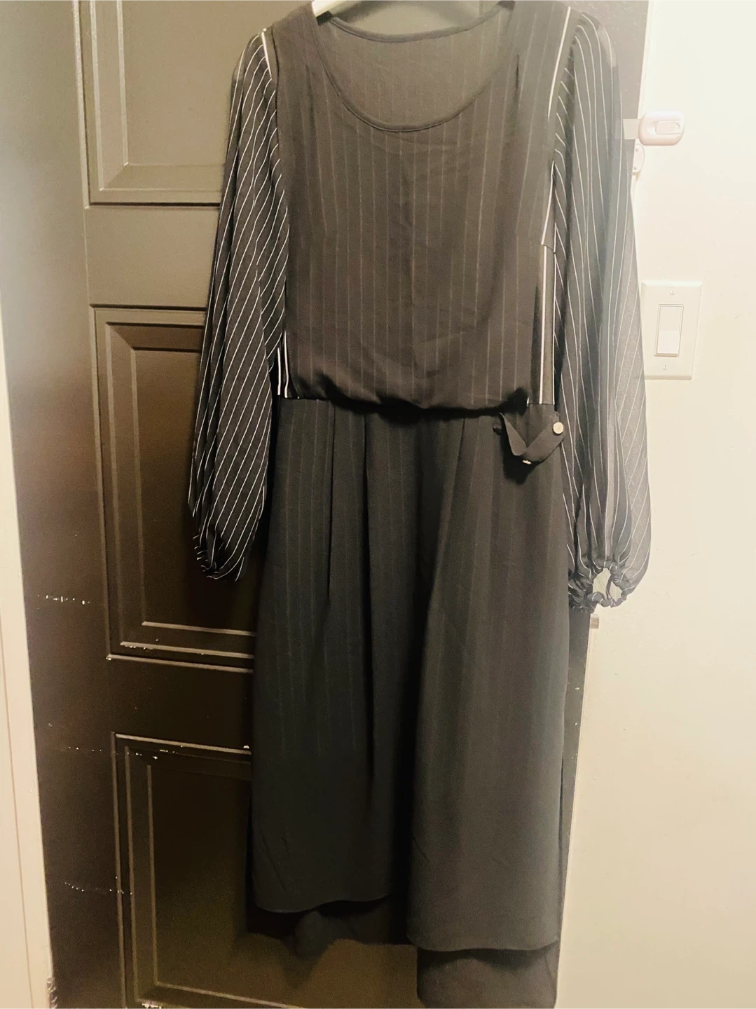 A lovely black dress with subtle pinstripes. It features long sleeves and a comfortable fit, perfect for various occasions. The material is lightweight and flowy, making it a great addition to your wardrobe!