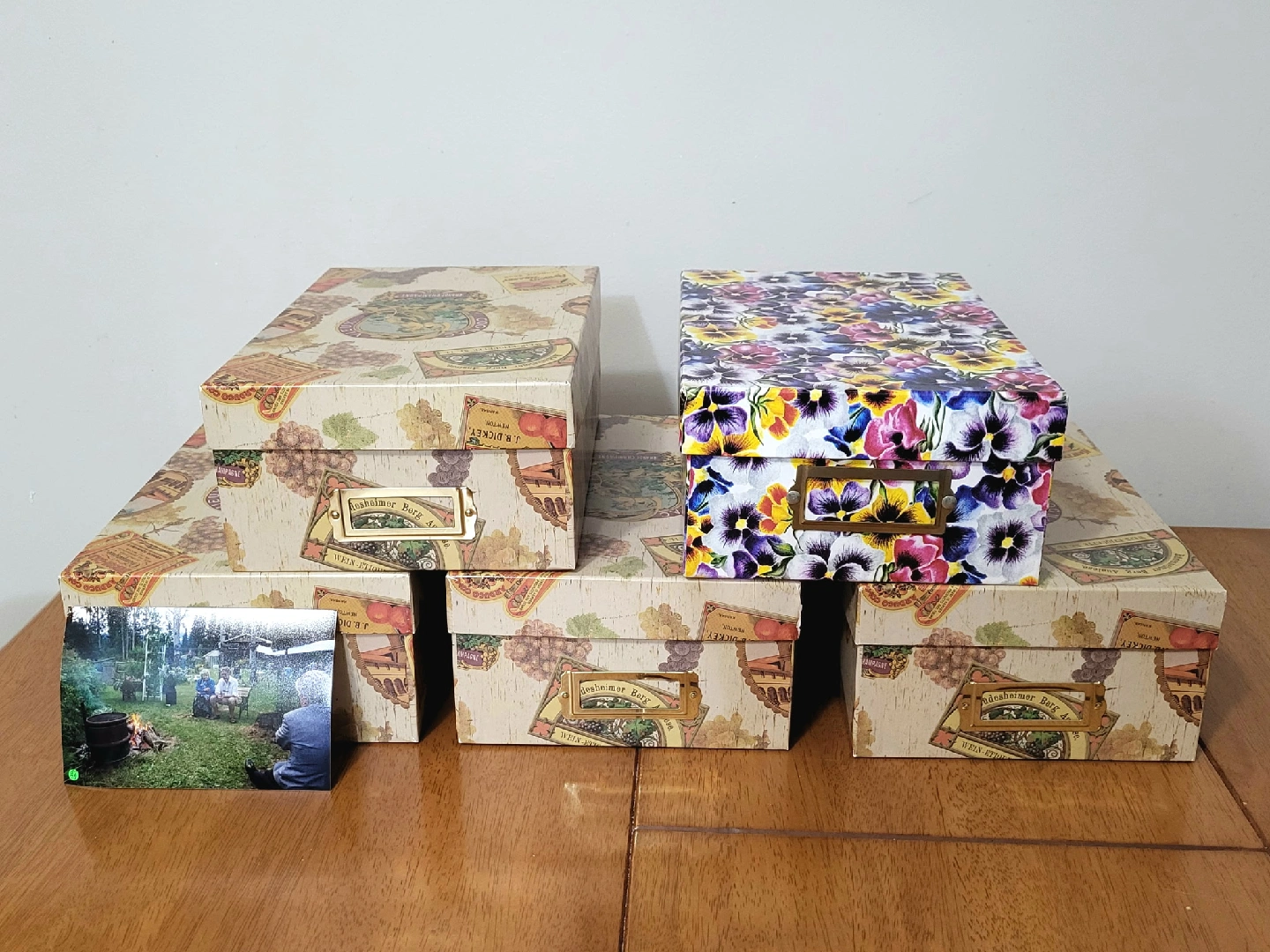 Selling a set of five decorative storage boxes. They come in two different patterns: a floral design and a wine-themed design. Perfect for organizing your space with a touch of style!