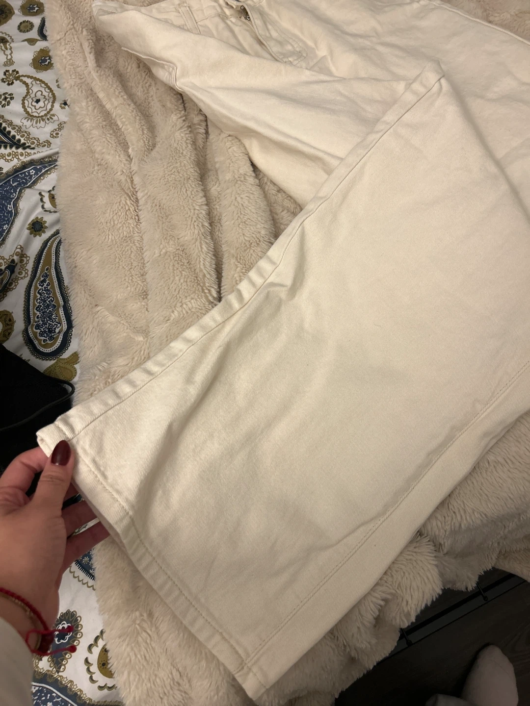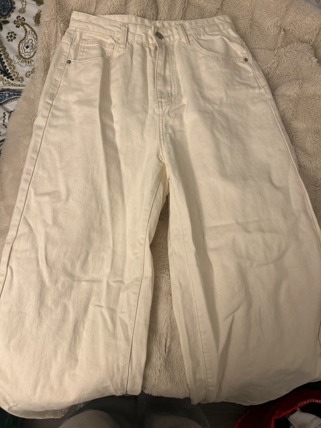 65Selling a pair of wide-leg jeans in a cream color. They're in great condition and ready for a new home! Perfect for a casual and stylish look