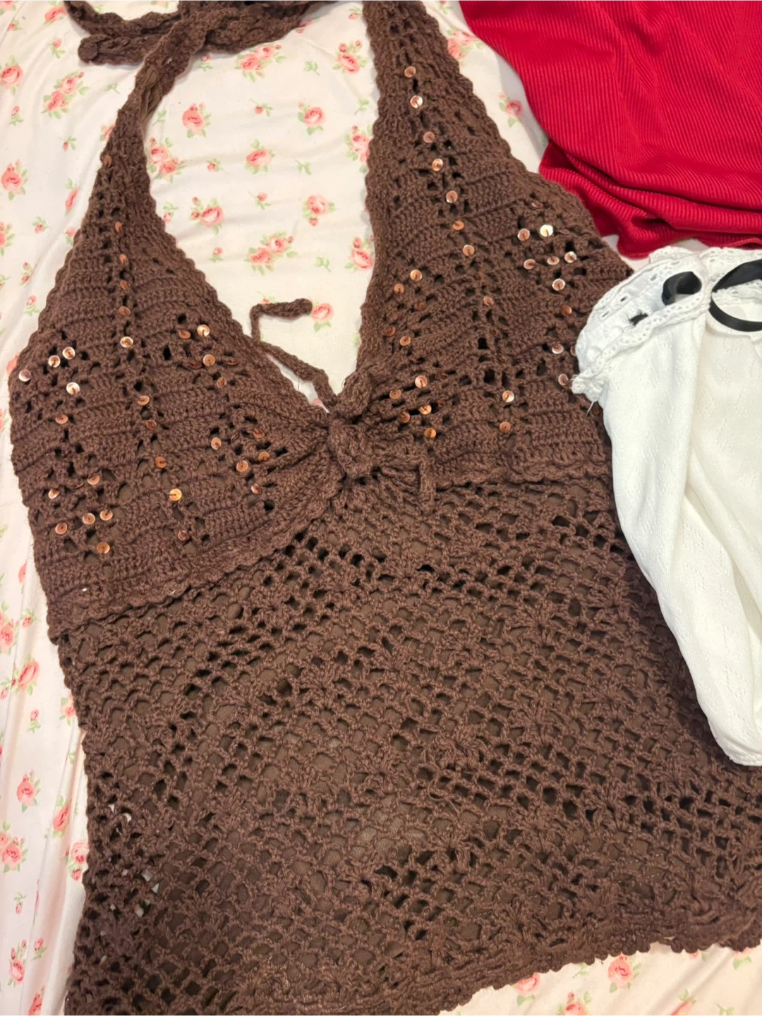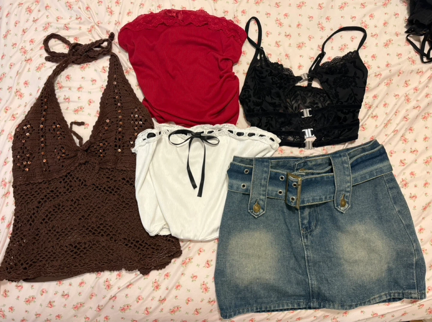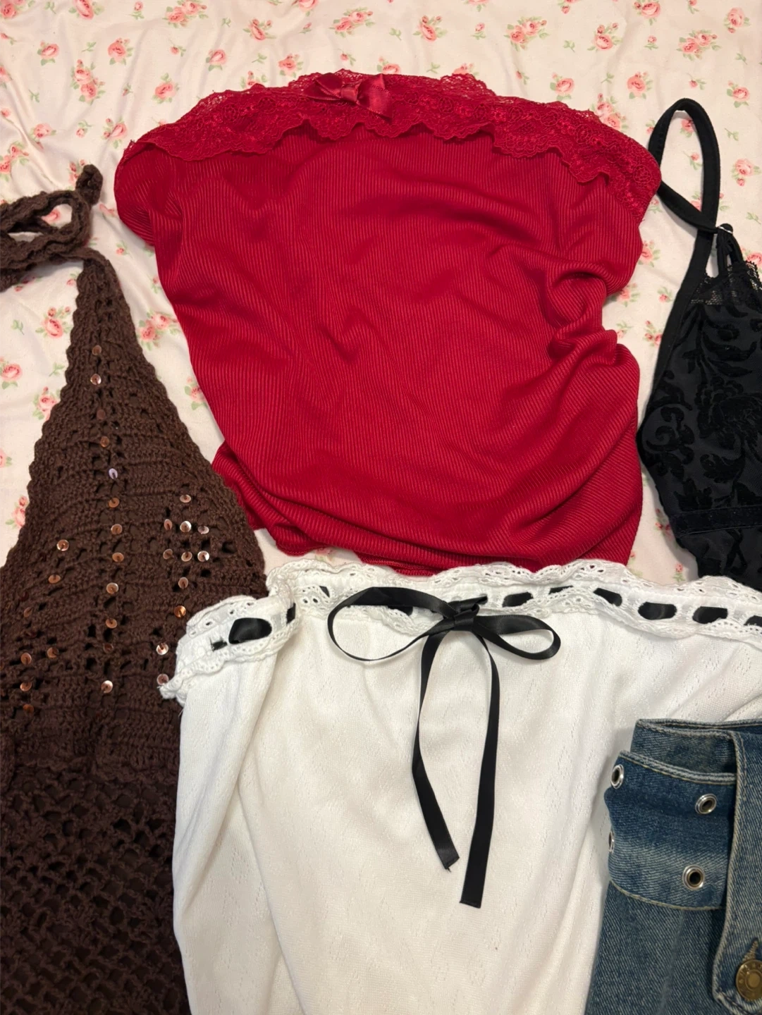Selling a variety of women's tops and a denim mini skirt! There's a brown crochet halter top, a red ribbed short-sleeve top, a black lace top, a white off-the-shoulder top with a black ribbon, and a denim mini skirt with belt detailing.
