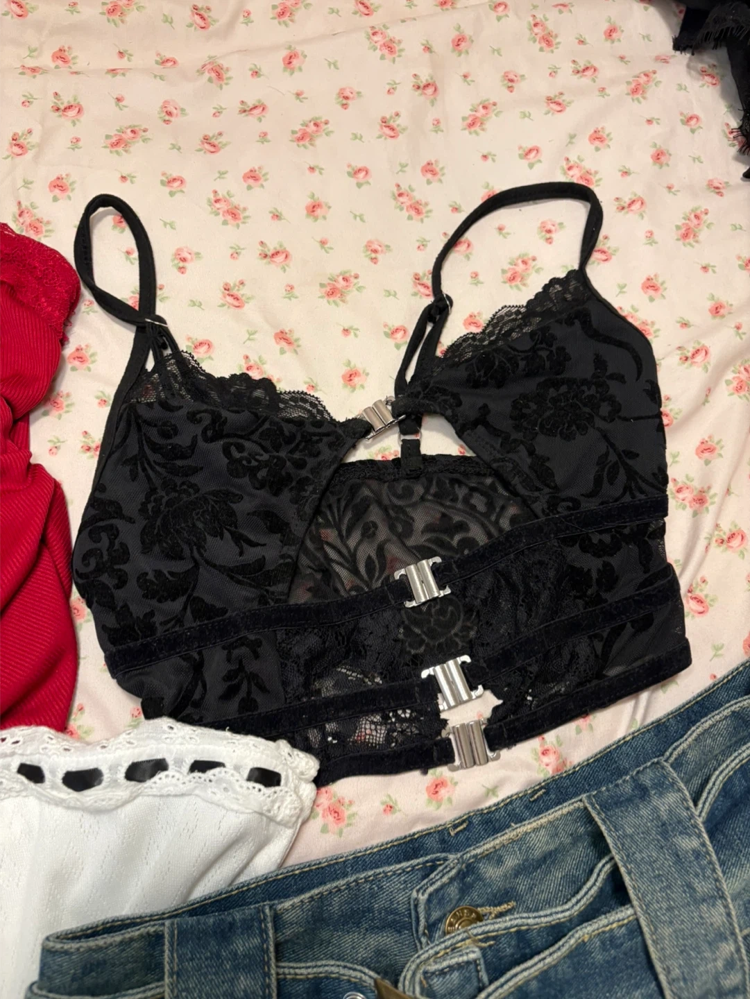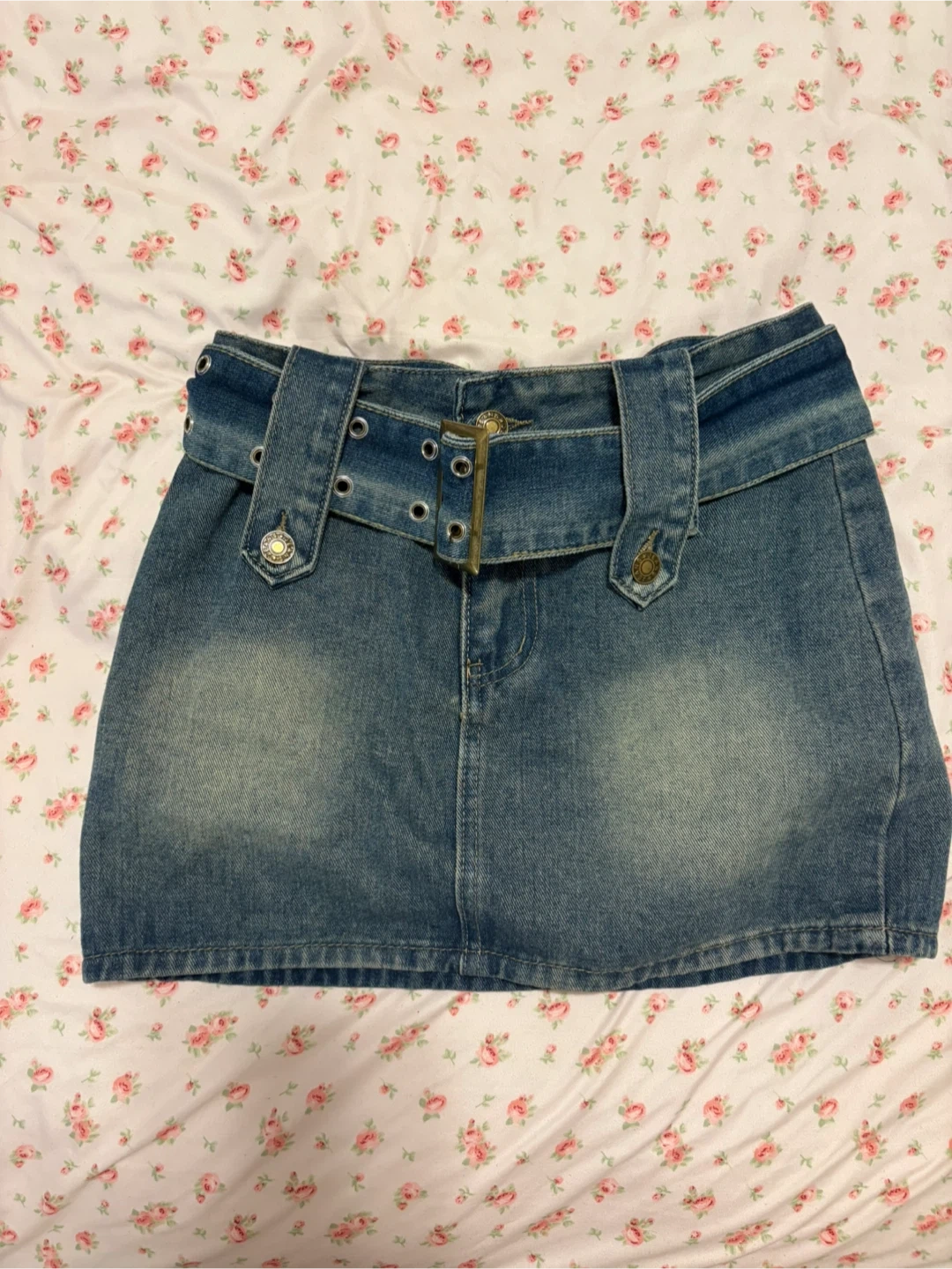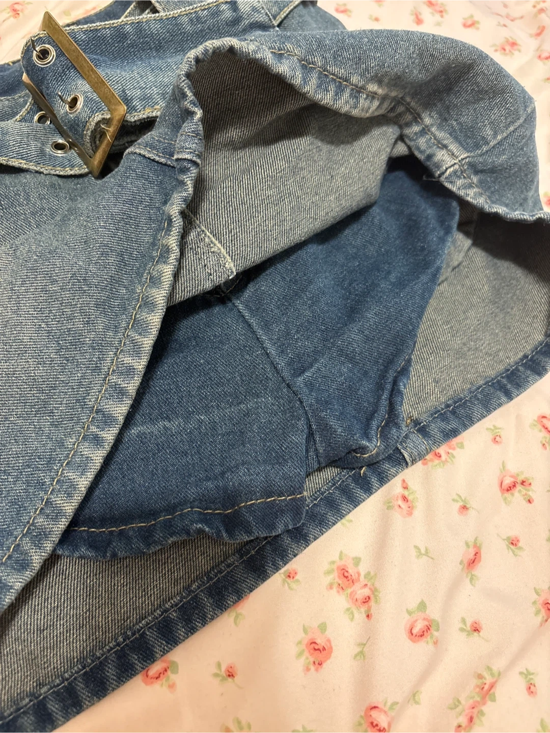 Selling a variety of women's tops and a denim mini skirt! There's a brown crochet halter top, a red ribbed short-sleeve top, a black lace top, a white off-the-shoulder top with a black ribbon, and a denim mini skirt with belt detailing.