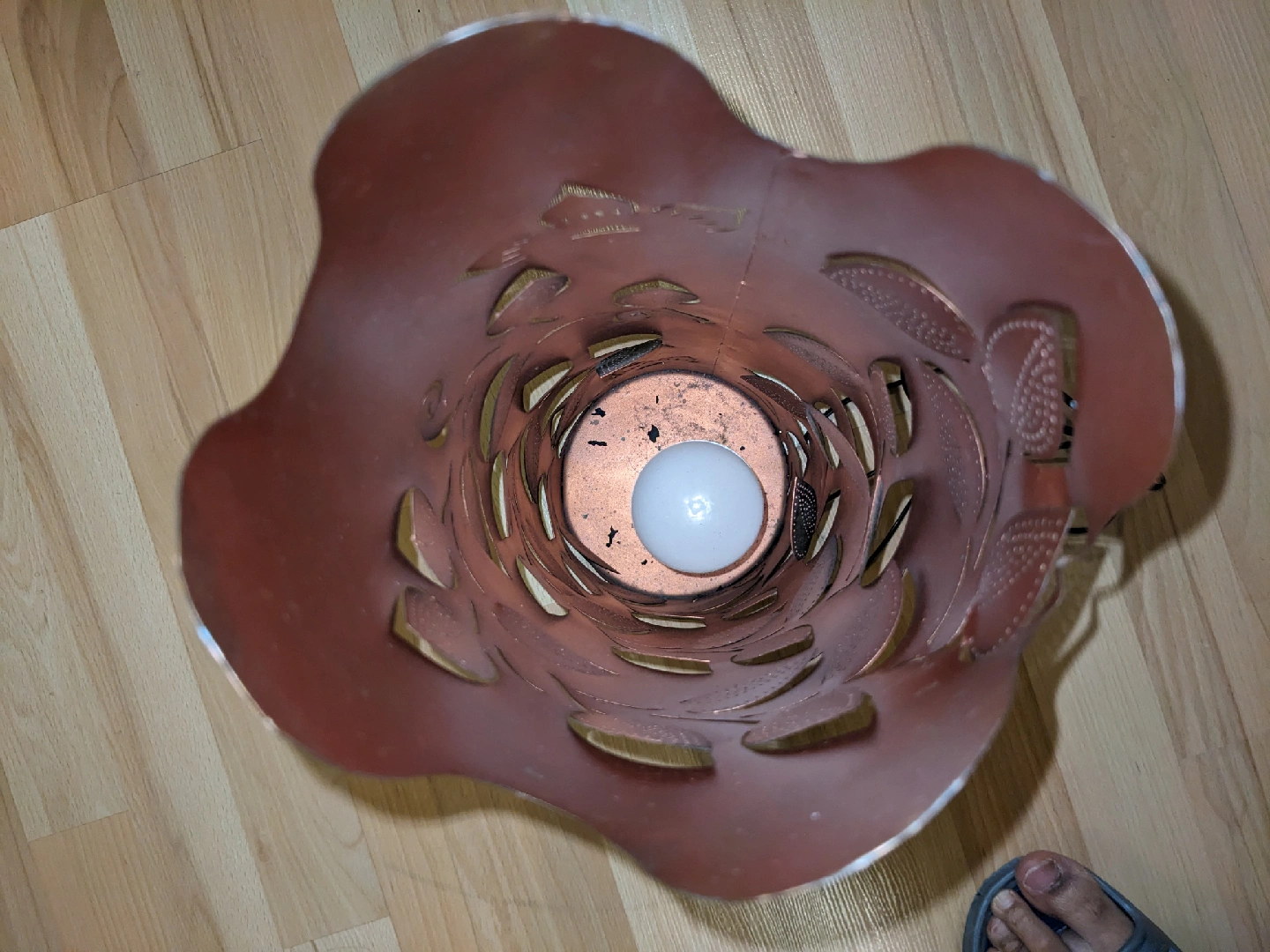 This is a unique metal vase that can also be used as a lamp with a leaf cutout design. It's a beautiful piece that adds a touch of elegance to any room.