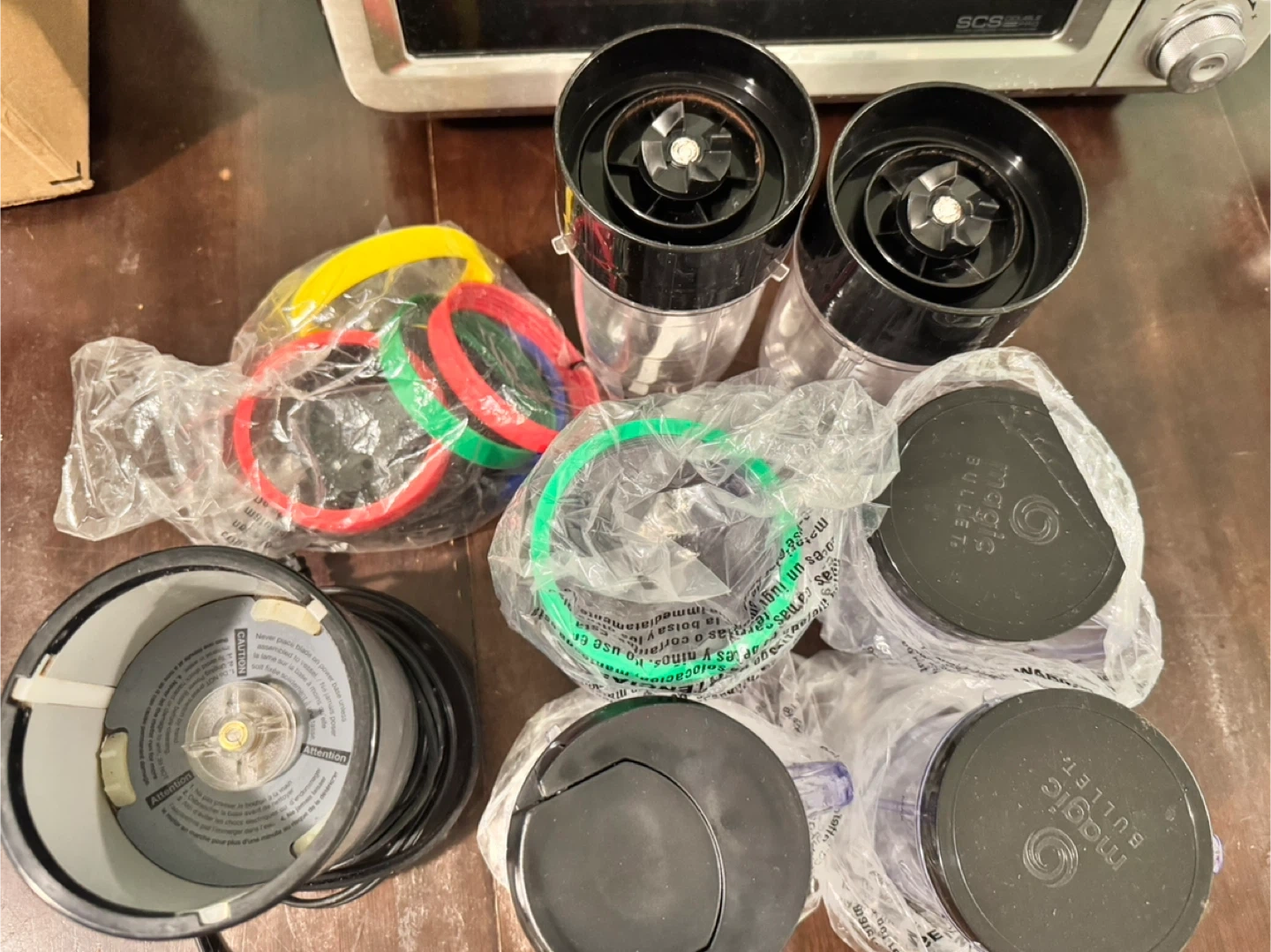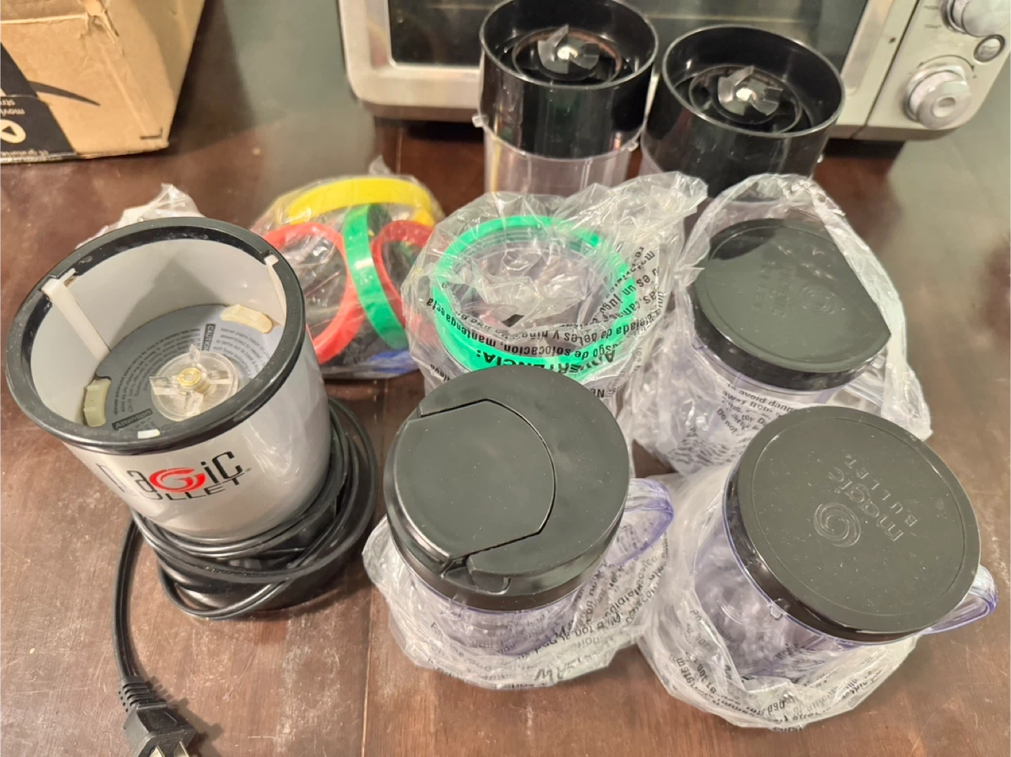 802Selling a Magic Bullet blender set. It comes with all the pieces you see in the photos, including multiple cups and lids. Great for making smoothies and other quick blending tasks! Not always but sometimes licking liquid bit. I think little invisible cracks the cover of cups. The bottom device works perfectly.