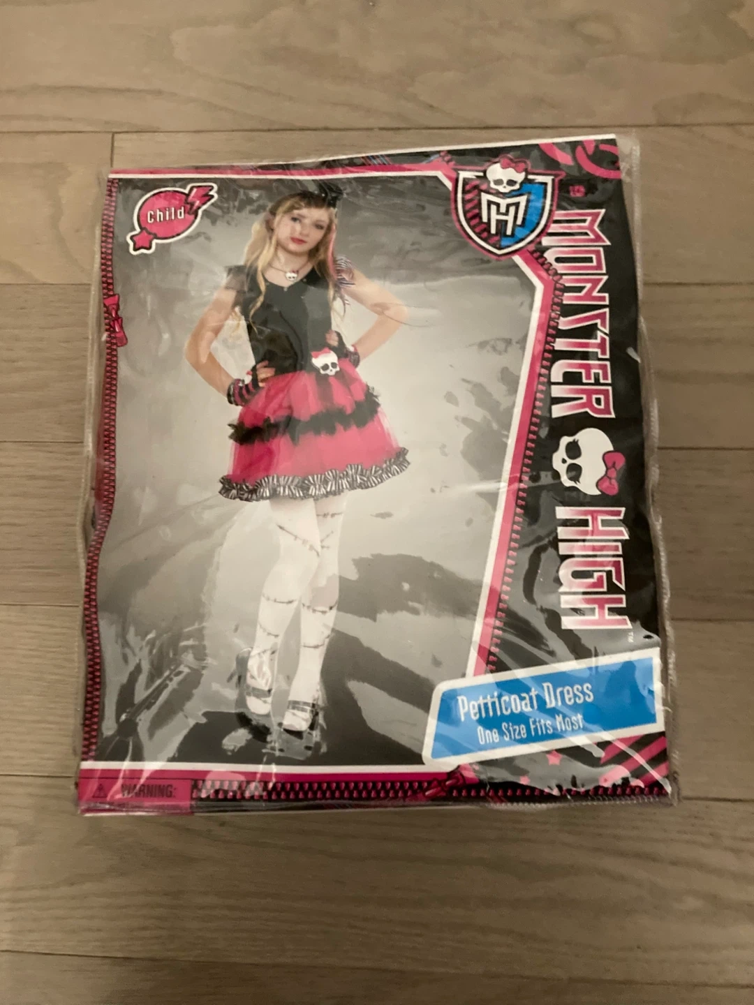 Monster High Petticoat Dress for a child! This costume features a black and pink dress with a crinoline skirt, perfect for any Monster High fan. The packaging indicates it's a 'one size fits most' for children. Great for dress-up or Halloween!
