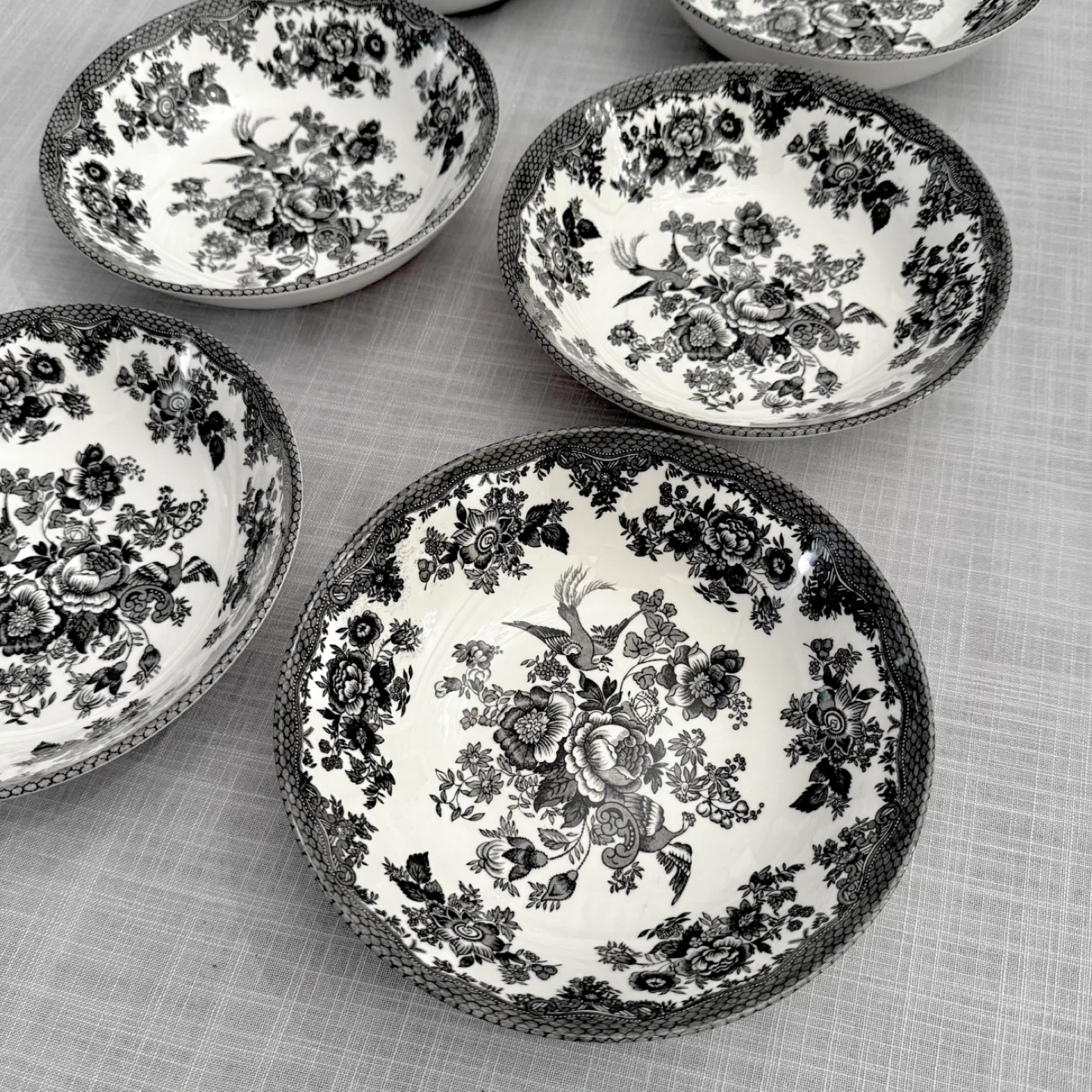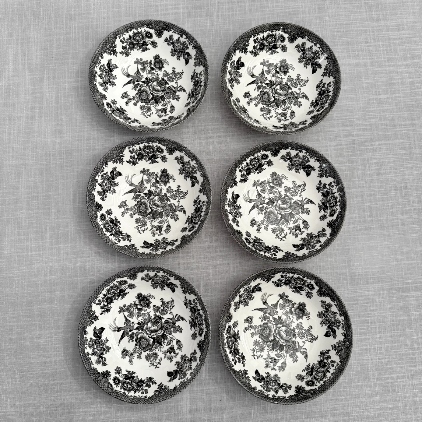 Set of 6 Royal Stafford (made in England) fine earthenware bowls (7.5” diameter x 2” high) in the black Asiatic Pheasant pattern. No chips, cracks or crazing — in like-new condition