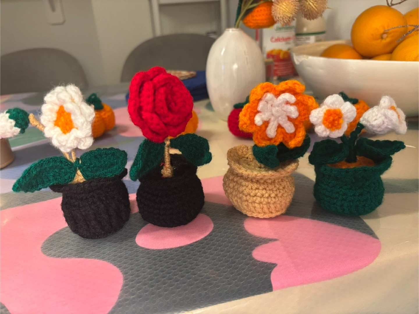 Check out these adorable handmade crocheted flower pots! They're perfect for adding a touch of whimsy to any space. Each one is unique and carefully crafted with love. They would look so cute on a desk or shelf!