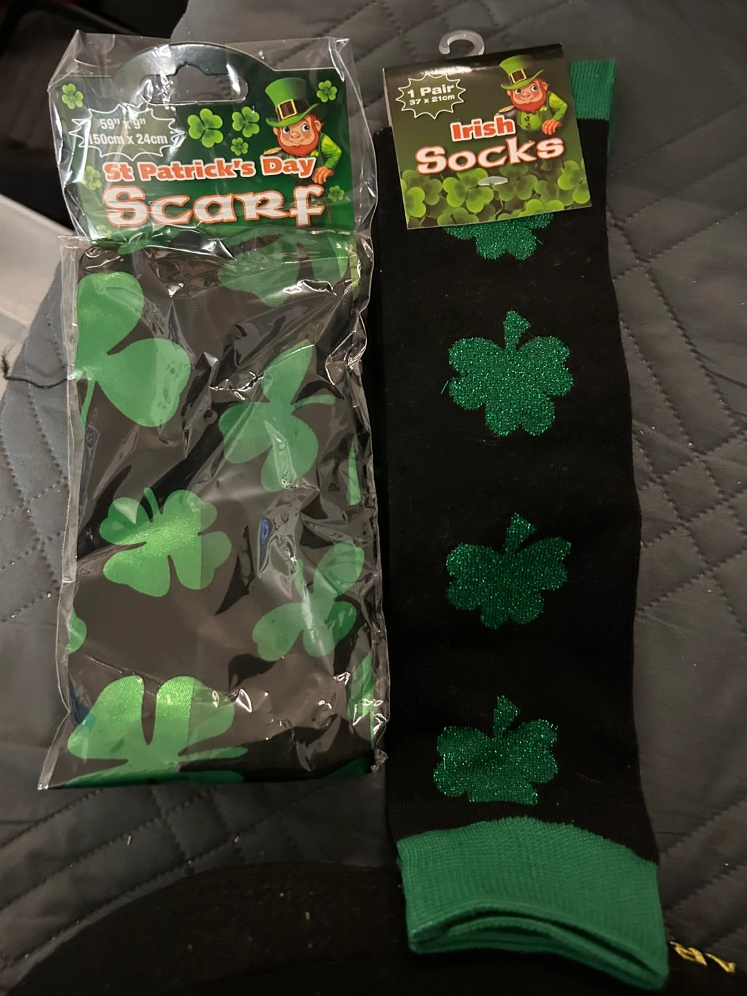 613Get ready for St Patrick's Day with this fun neck tie and socks set! The scarf measures 59" x 9" (150cm x 24cm), and the socks are a 1 pair set with a cute Irish design