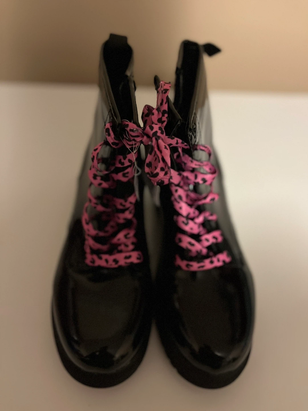 These are a pair of new black patent boots from Cherokee! They feature a fun pink and black leopard print lace. The boots are a size 6 and have a chunky sole. Perfect for adding a bit of edge to any outfit