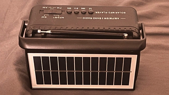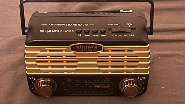 Listen to your favourite tunes with this XHDATA D-902 radio! This is a used AM/FM/SW 3 band portable radio that can also play MP3s and connect via Bluetooth. It even has a solar panel for charging on the go. This radio system is in excellent condition. It also has a led light for lighting in the dark to work as a flashlight. Very light weight. Here are some specifications: * AM/FM/SW 3 Band Radio * USB - MP3 Player * Bluetooth Connectivity * 3 Way Charging - USB-B wire / BATTERY/ Solar Panel Charging Measurement: It is 6 by 3 by 4 inches in its dimensional size. My price reflects the radio's excellent condition and features. If you're seeing this ad, the radio is still available!